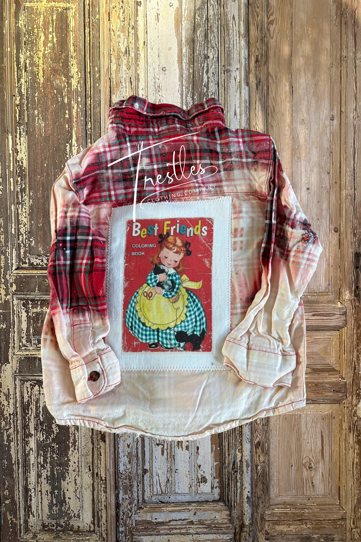 Dress your little one in nostalgic, one-of-a-kind style with our Best Friends flannel from The Vintage Baby & Kids Collection! This lightly distressed, upcycled baby flannel features a vintage-inspired back patch, showcasing a reproduction of a classic children’s coloring book cover from a simpler time.