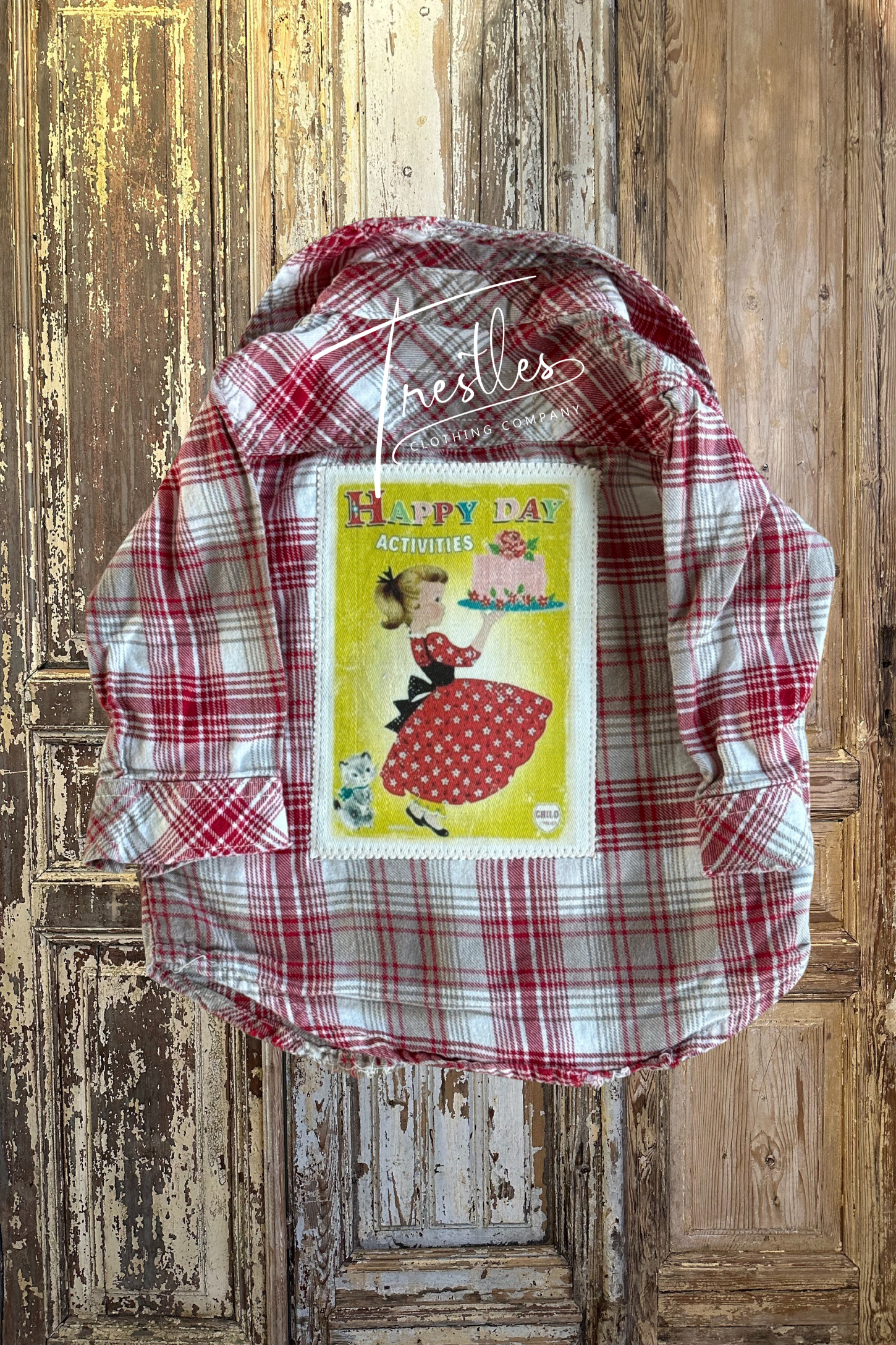 Dress your little one in nostalgic, one-of-a-kind style with our Happy Day flannel from The Vintage Baby & Kids Collection! This lightly distressed, upcycled baby flannel features a vintage-inspired back patch, showcasing a reproduction of a classic children’s coloring book cover from a simpler time.