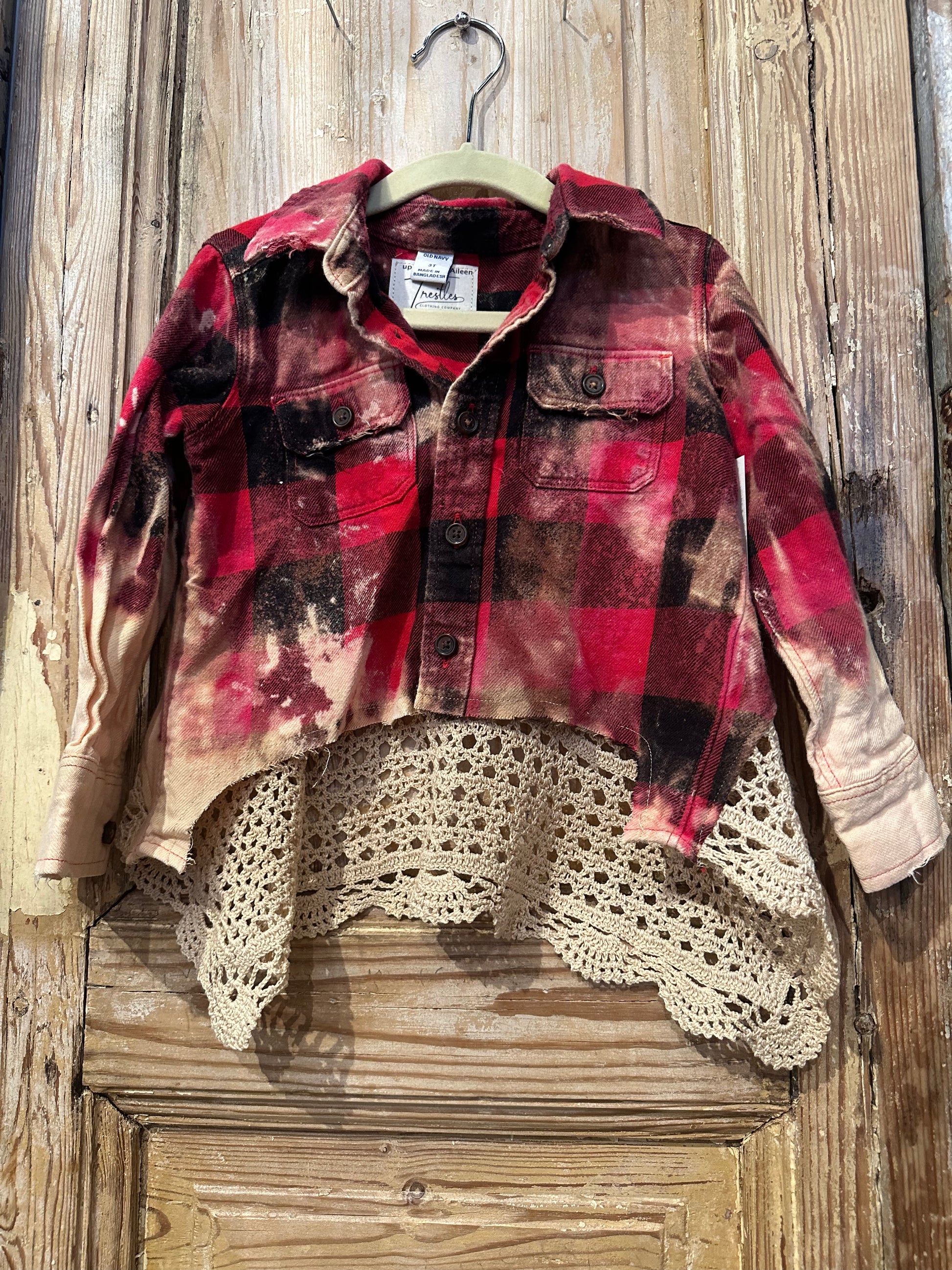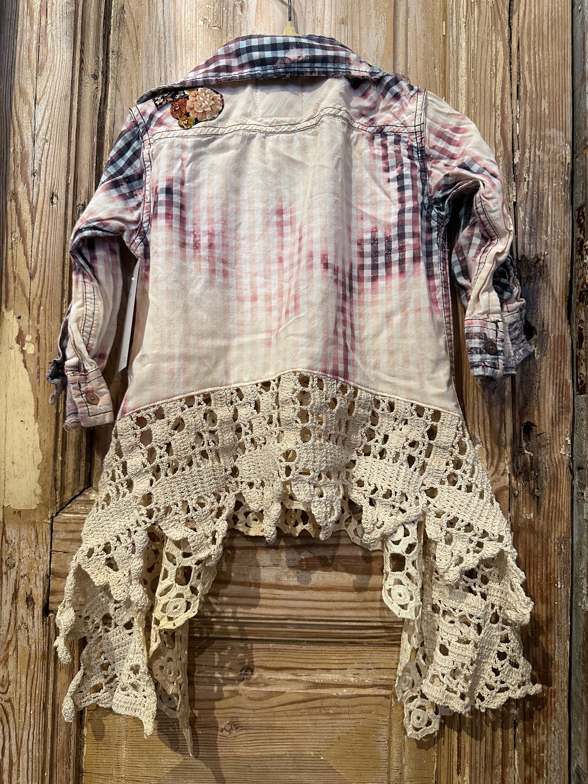 The Up Cycled Kids Plaid Shirt is a true labor of love from Aileen’s Hippie Baby Collection, where every piece tells a story 💫 Each shirt begins as a pre-loved plaid, bleached and lightly distressed for that perfectly worn-in, vintage look. The hi-low design is finished with repurposed vintage lace — treasures Aileen hand-selects each year from the Hospice Thrift Shop in the Bay Area. She never quite knows how the lace will be used, but her passion for vintage textiles always finds a way to shine through 🕊️