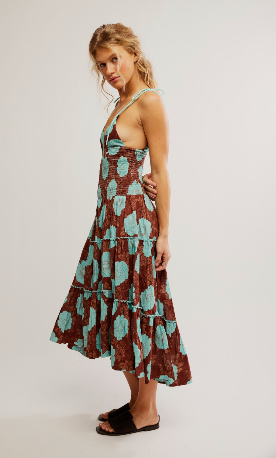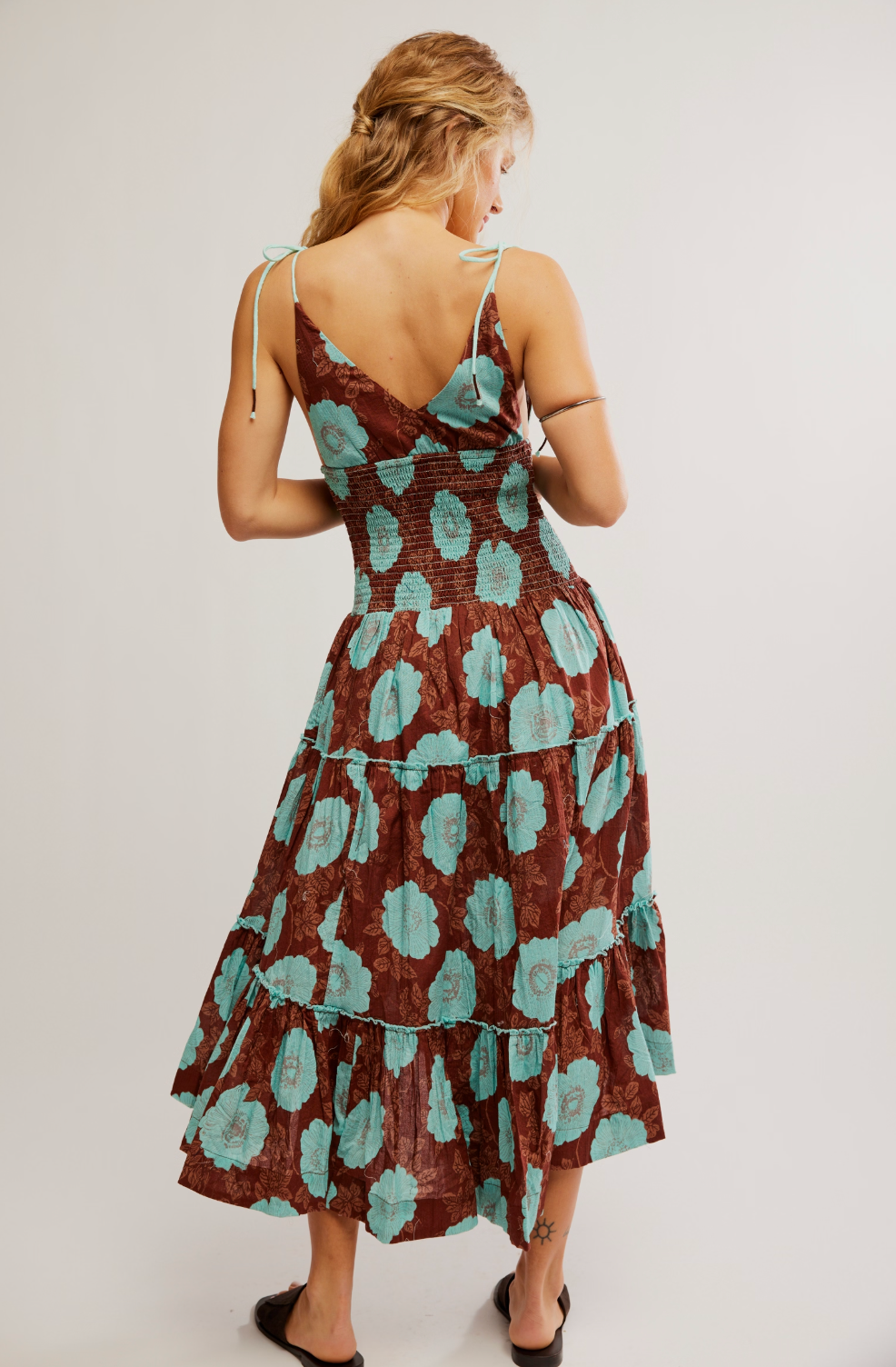 • Design: Smocked, fitted torso with flowy tiered midi-length skirt