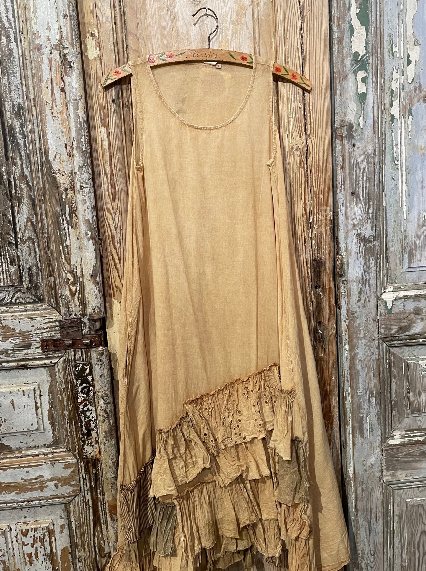 Unleash your inner eccentricity with our Artsy Uneven Ruffle Dress. Adorned with 5 delicate layers of eyelit and cotton ruffles in front, this tank dress adds a touch of whimsy to any outfit. Its oversized, lightweight cotton design and tea-dyed finish make it the perfect easy layering piece for your wardrobe. Go ahead, embrace the unconventional.