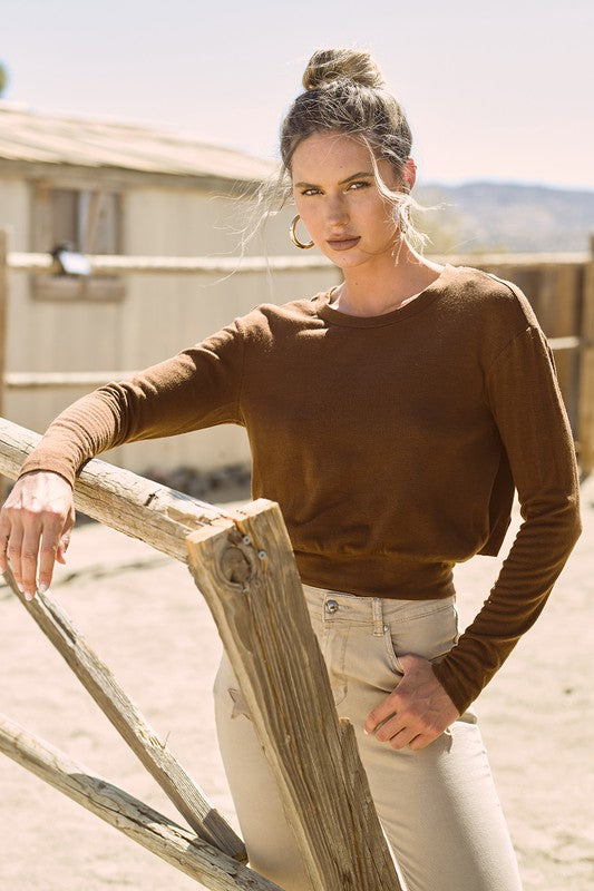 If you love your sweaters cropped you will love this Back Tie Sweater.  Cute, simple and easy to wear with your jeans and cotton twill pants.  The long back tie give this cropped sweater a cool silhouette.