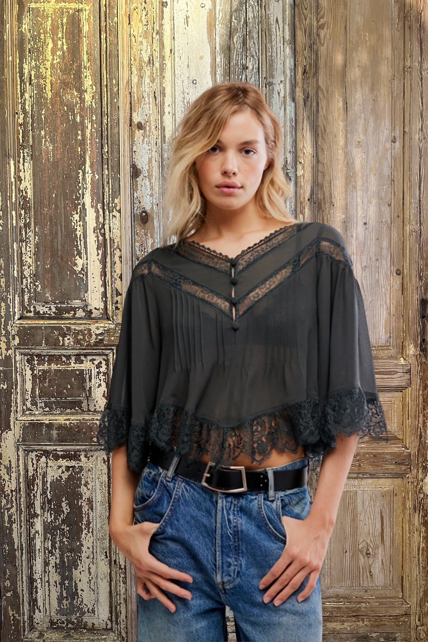 Step into vintage-inspired magic with the Bali Midnight Rain Top by Free People. ✨ This breezy, lightweight blouse flows effortlessly with lace details at the sleeves and hem, plus a sweet lace front v-neckline that adds a touch of old-soul charm. Crafted in 100% polyester for a flowy fit, it’s the kind of top that instantly transforms your outfit. Pair it with rugged denim for that easy boho hippie vibe — comfortable, romantic, and free-spirited. 🌼🌙
