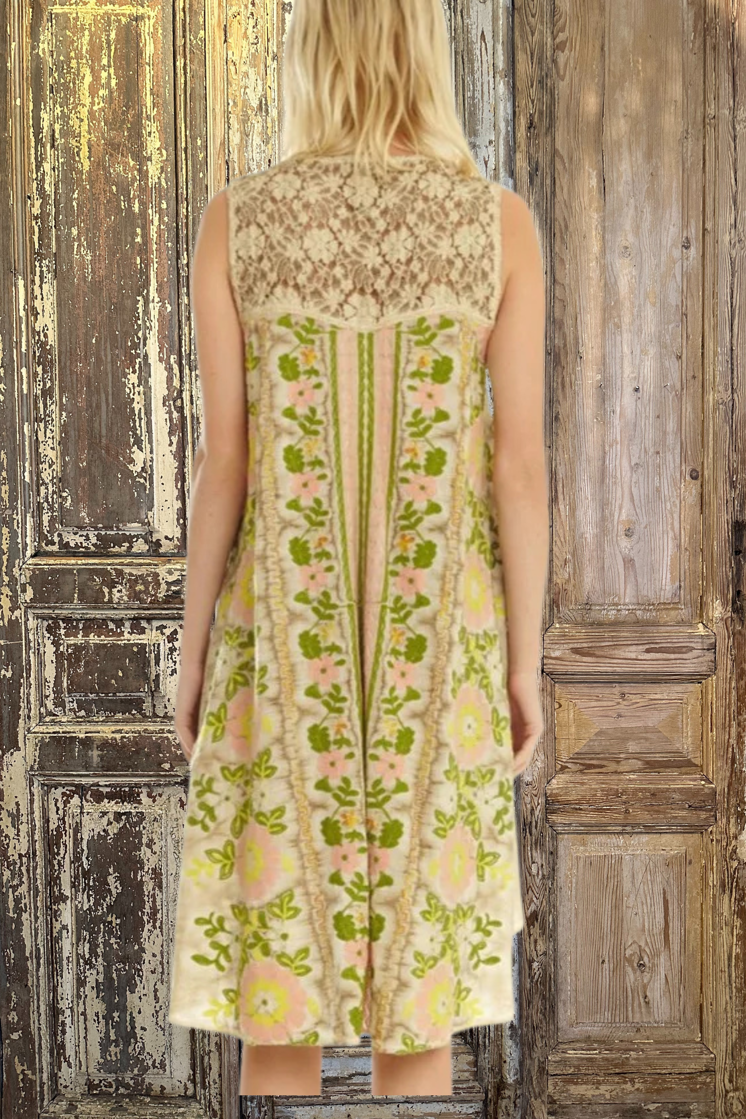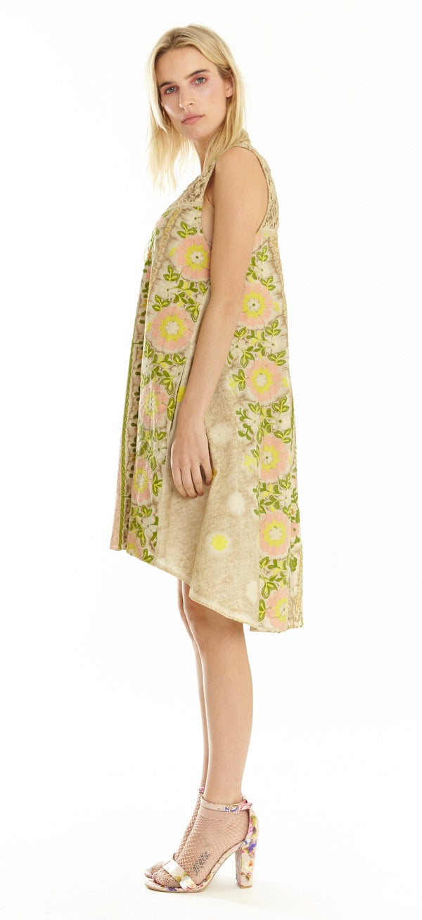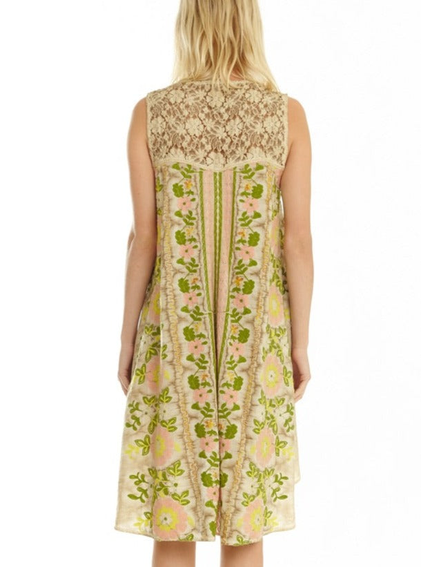 Unleash your vintage charm in our Better Than Anyone Dress! With a mix of delicate lace and intricate embroidered florals on tea stained fabric, this high lo design is perfect for any occasion. Style it as a dress or tunic outerwear with mini front buttons.