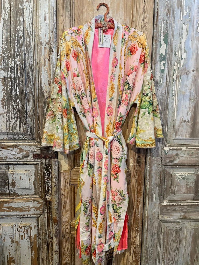 This exquisite kimono is a timeless piece of art - with Shabby Chic meets Marie Antoinette style - designed to channel your inner goddess. Features include luxurious color coral pink lining, cotton lace printed boho sleeves, tasseled belt and Venus print back - a must-have for any wardrobe.