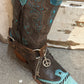 Turn heads from the ground up with our Statement Boot Belt, designed by Aileen and imported straight from India. This isn’t your average cowgirl accessory — it’s a layered masterpiece of leather ropes, etched metal studs, and dangling eclectic charms that bring serious personality to your boots. A metal chain drapes from a rugged leather belt, creating a perfect balance of edgy and boho-chic.