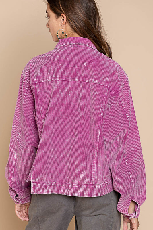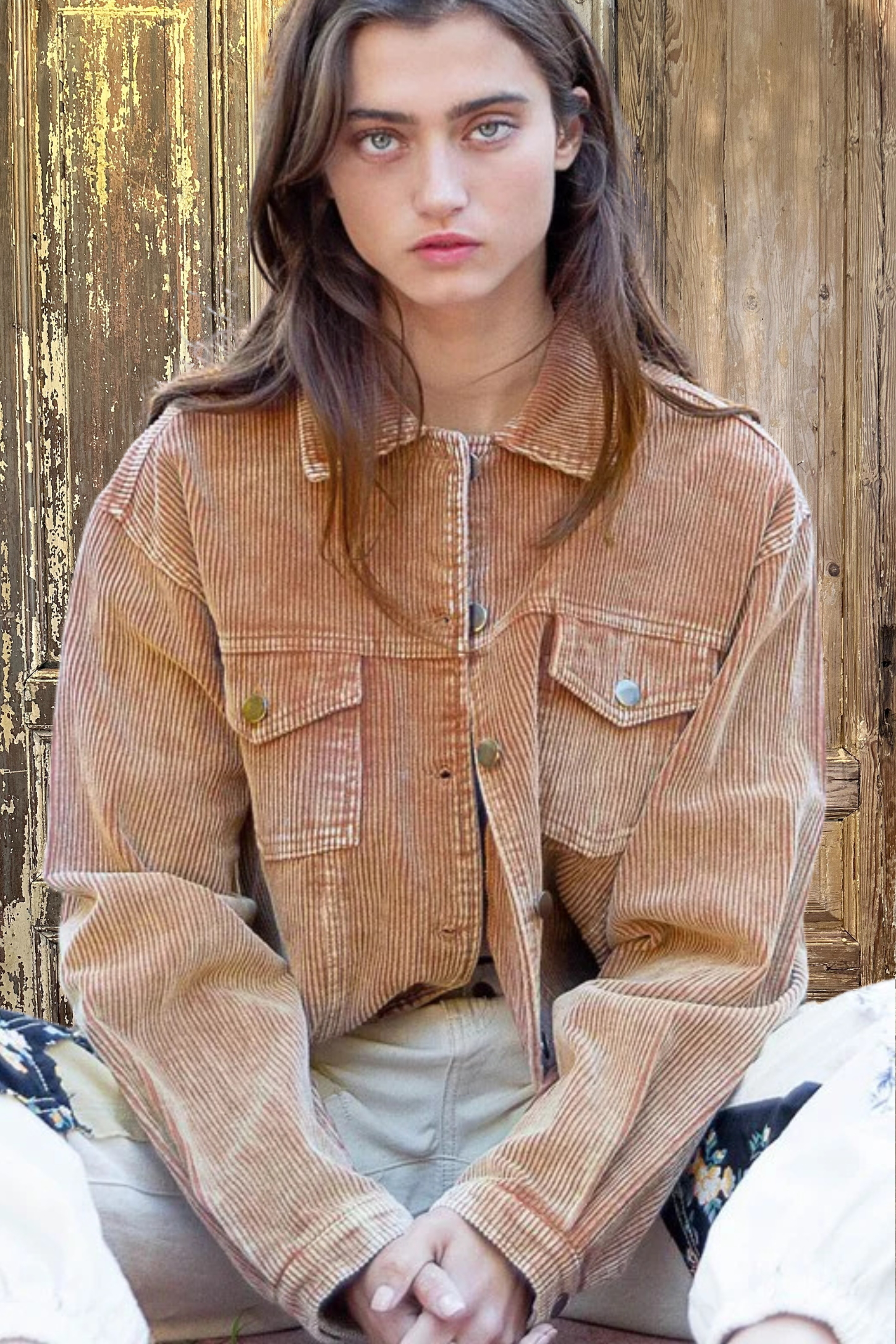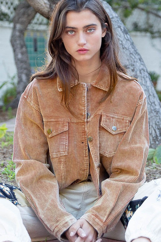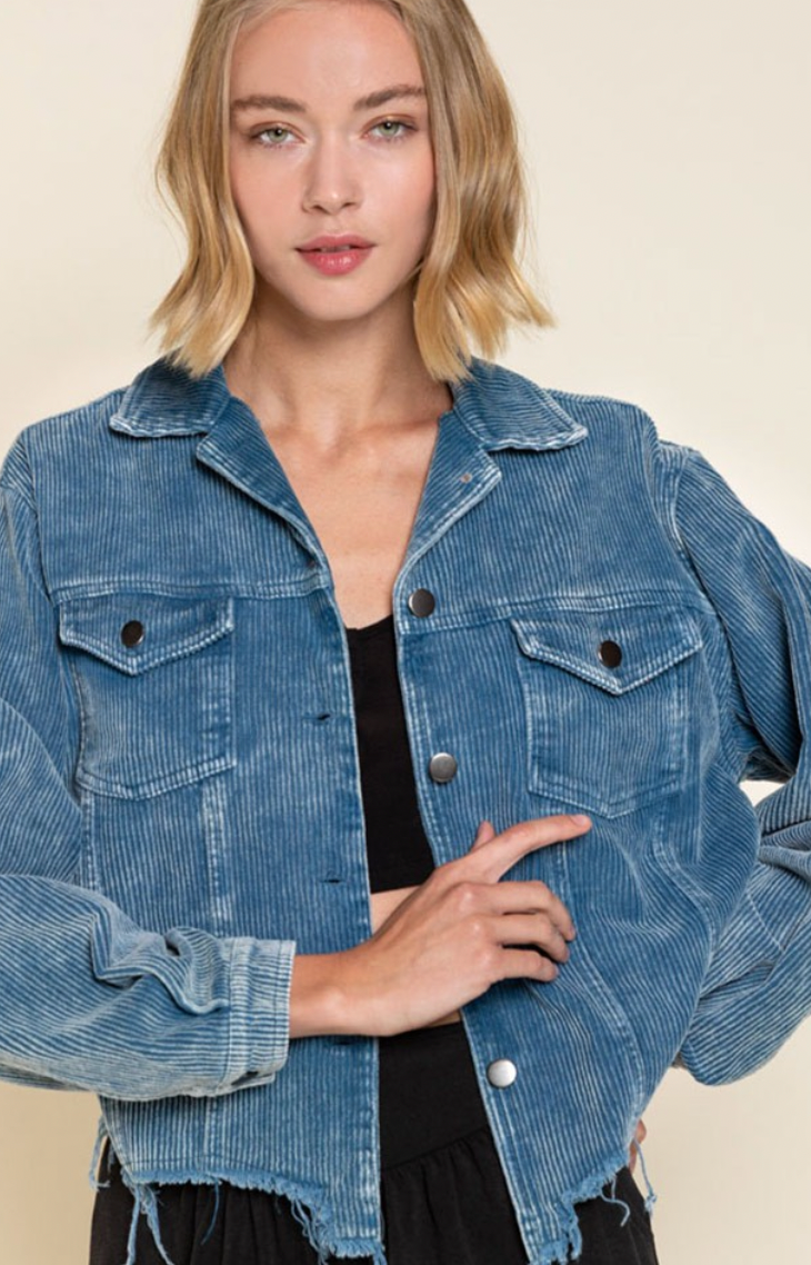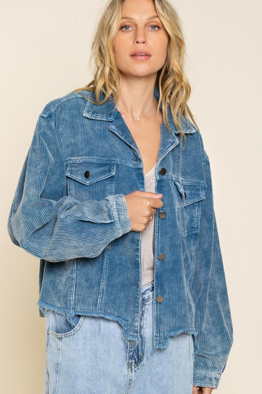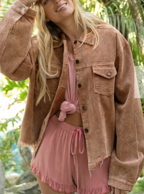 Slouchy Corduroy Jacket with a raw hemline and oversized for the ultimate urban vibe.  Mineral washed color, distressed cut hemline gives this corduroy jacket an edgy urban vibe.