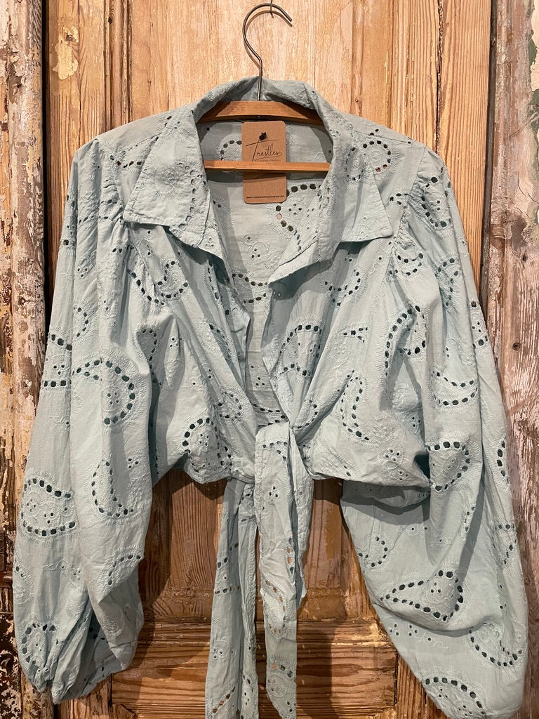 This cotton cardigan features a feminine eyelit fabric design and a front tie to cinch your waist, adding a touch of sophistication. With its collared neckline and puff long sleeves, it's the perfect layering piece over our matching Smocked Band Eyelit pants. Made with 100% cotton for comfort and breathability.
