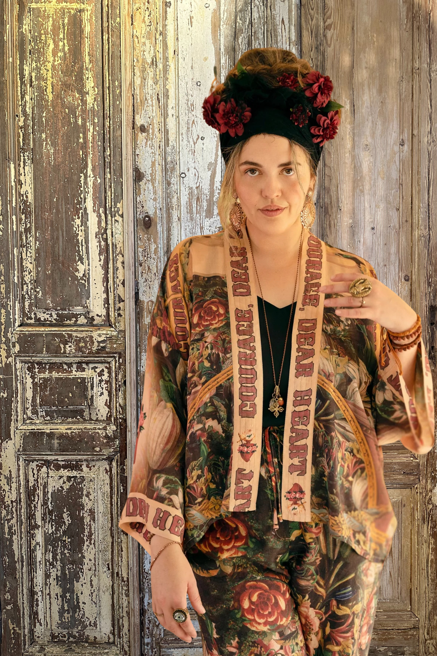 Let Love, Faith, and Courage accompany you on your journey with our Courage Dear Heart Cropped Kimono. Adorned with archival artwork from the 1800's, including hidden talismans of strength and a powerful quote from C.S. Lewis, this unique piece serves as a reminder to keep going, celebrate your tenacious spirit, and always be true to yourself.
