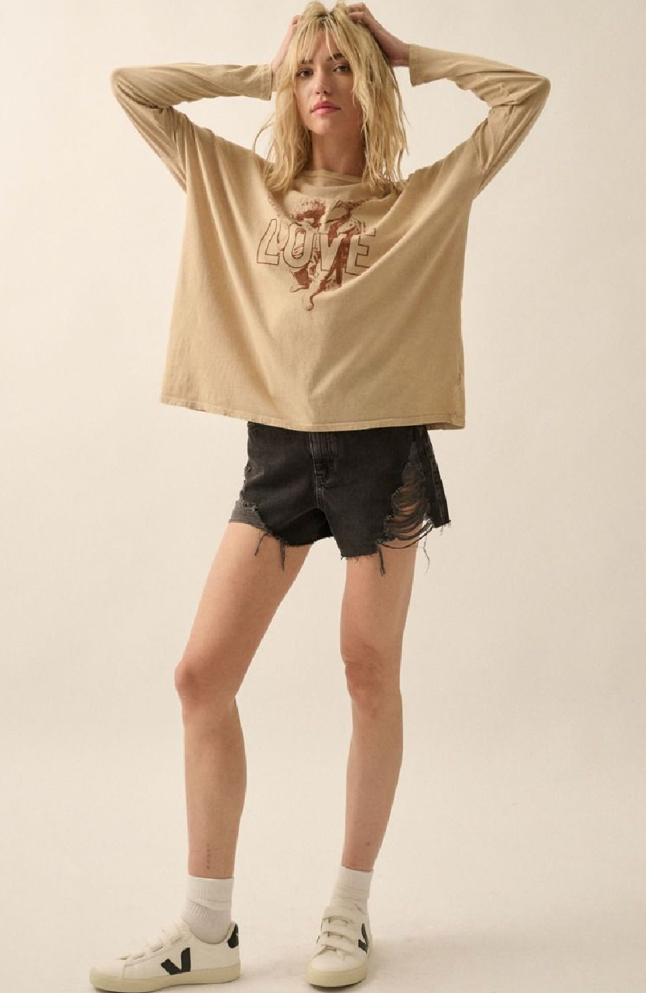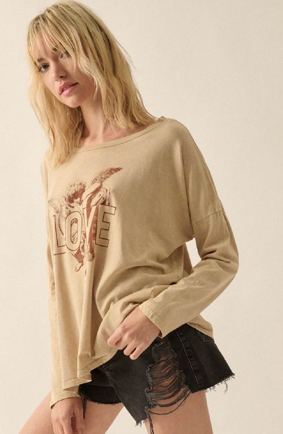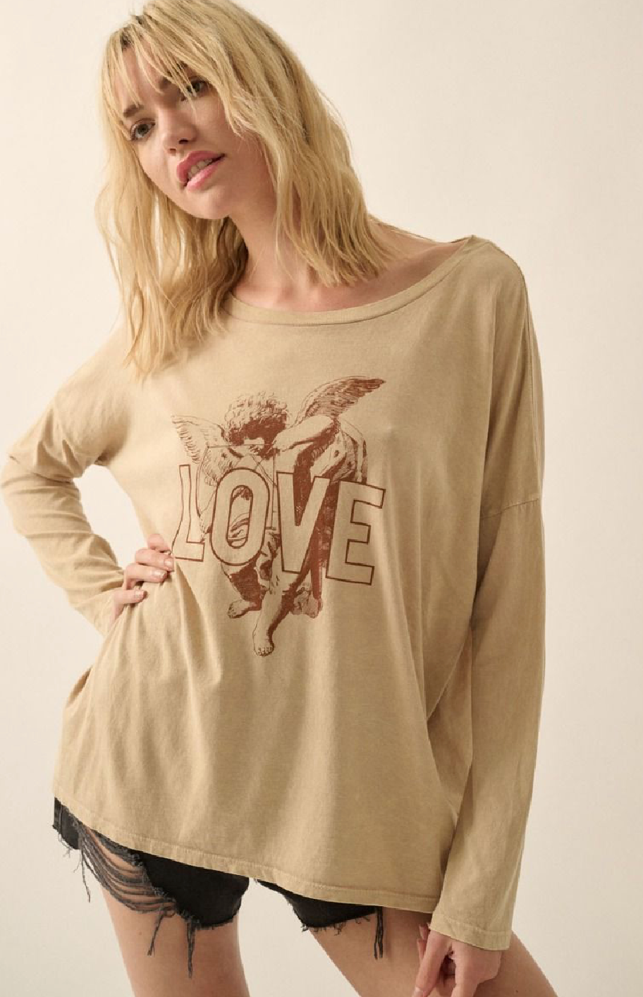 Fall head over heels for the Cupid L/S Top, a dreamy mix of vintage charm and effortless comfort. This mineral-washed knit graphic tee features a faded cupid print with bold “Love” lettering — giving major throwback feels with a modern twist.