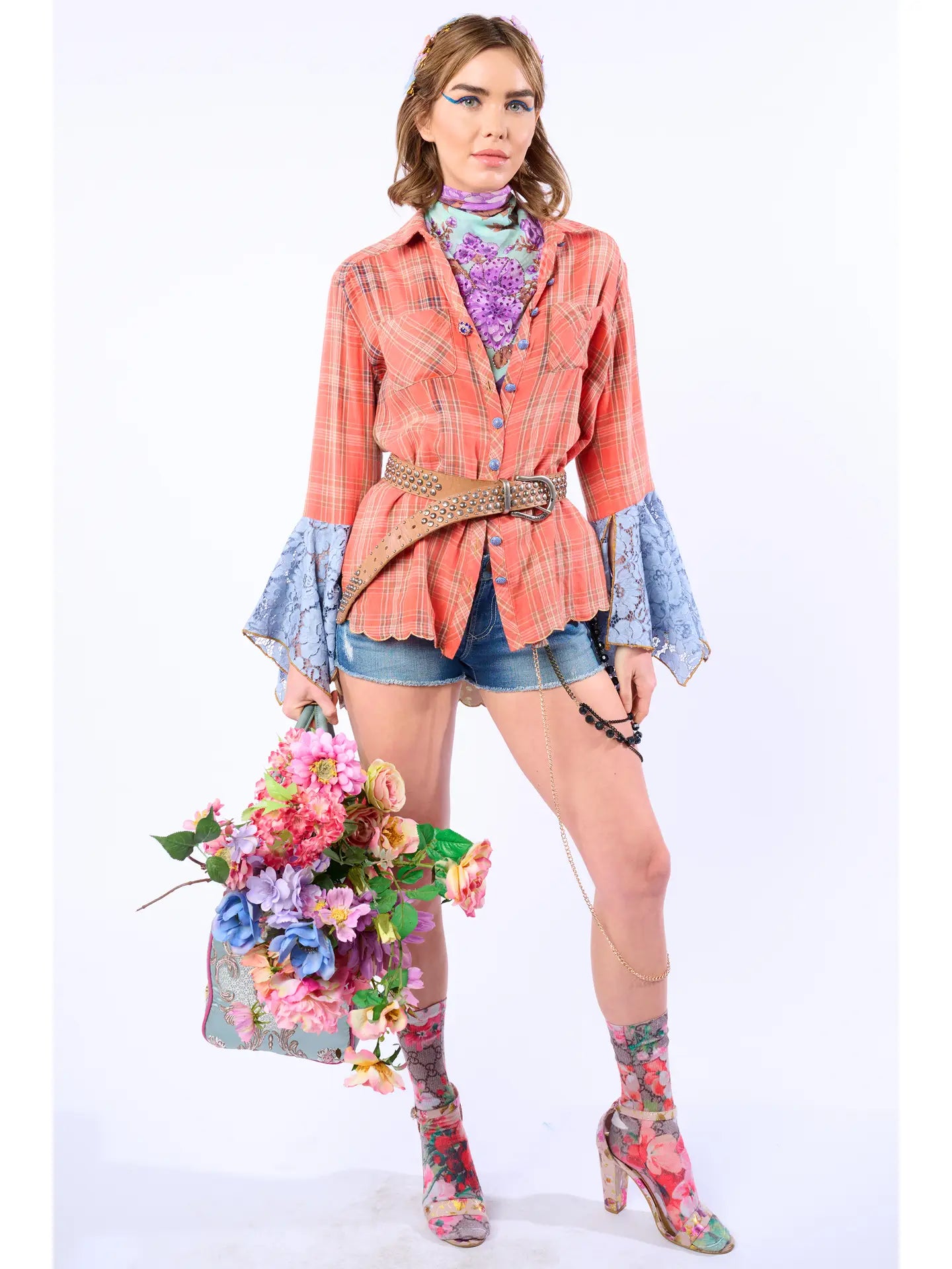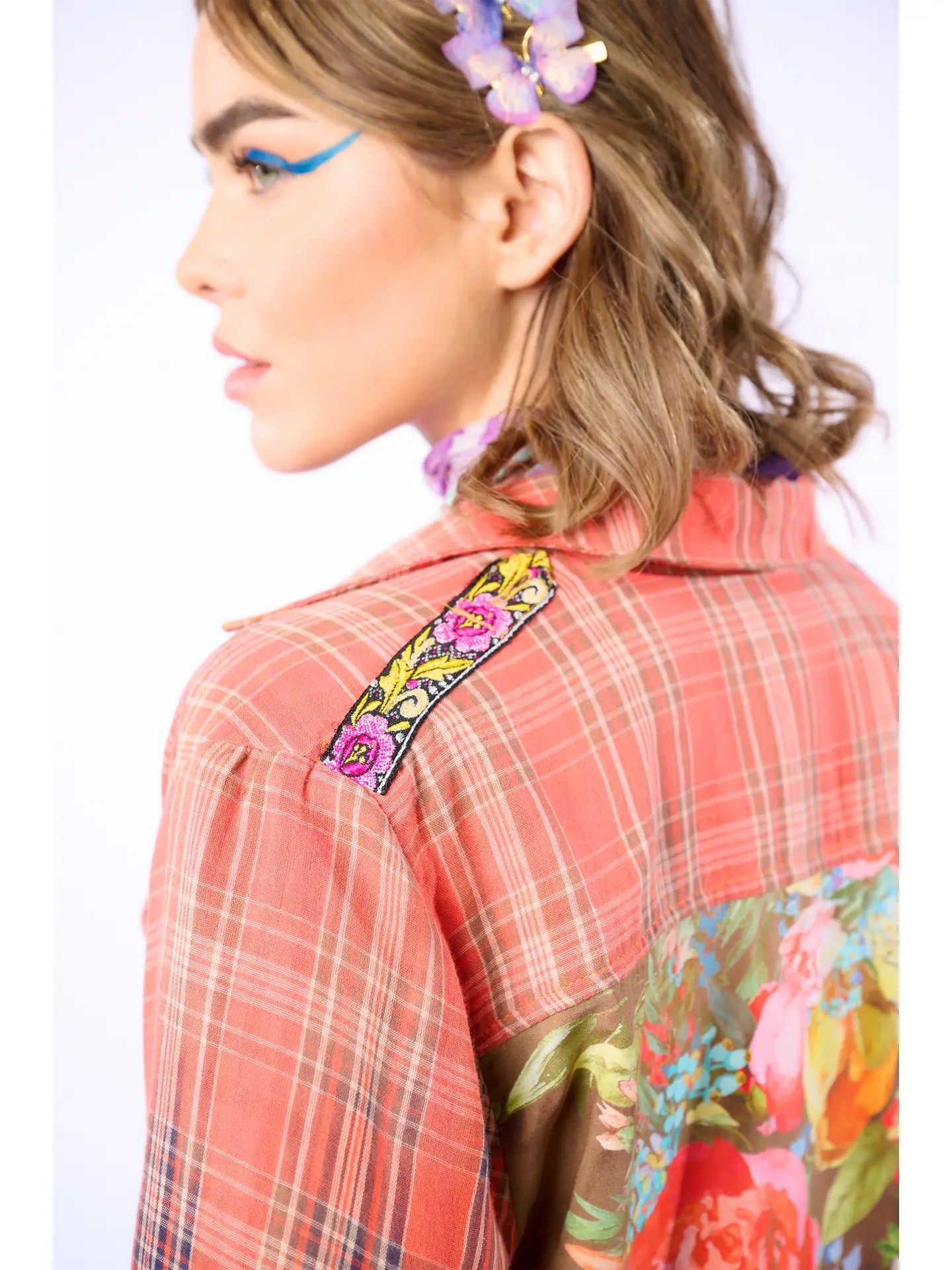 Meet the Eros Washed Shirt – a romantic twist on the classic plaid button-up. Washed in a warm rust tone with a worn-in feel, this long sleeve shirt is anything but ordinary. The back features a contrasting floral print that adds a dreamy, unexpected edge, while floral jacquard shoulder tabs and a lace ruffle at the sleeve bring in that soft, feminine magic.