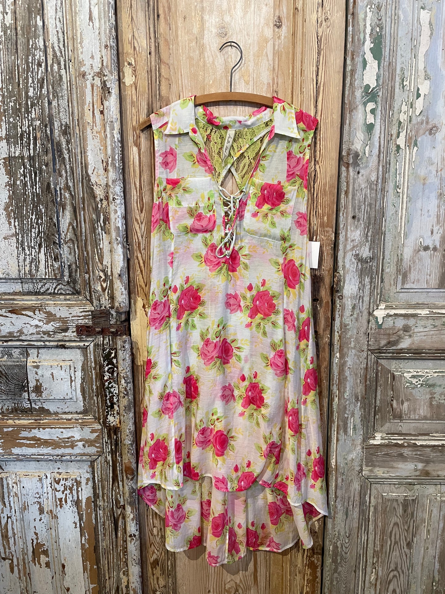 Get ready to bloom in the Evening Primrose Dress! This playful dress features a pretty pink and green floral print, front ties for a flattering fit, and a convenient front pocket. With side slits and a lace back detail, this dress is perfect for a fun, flirty look.