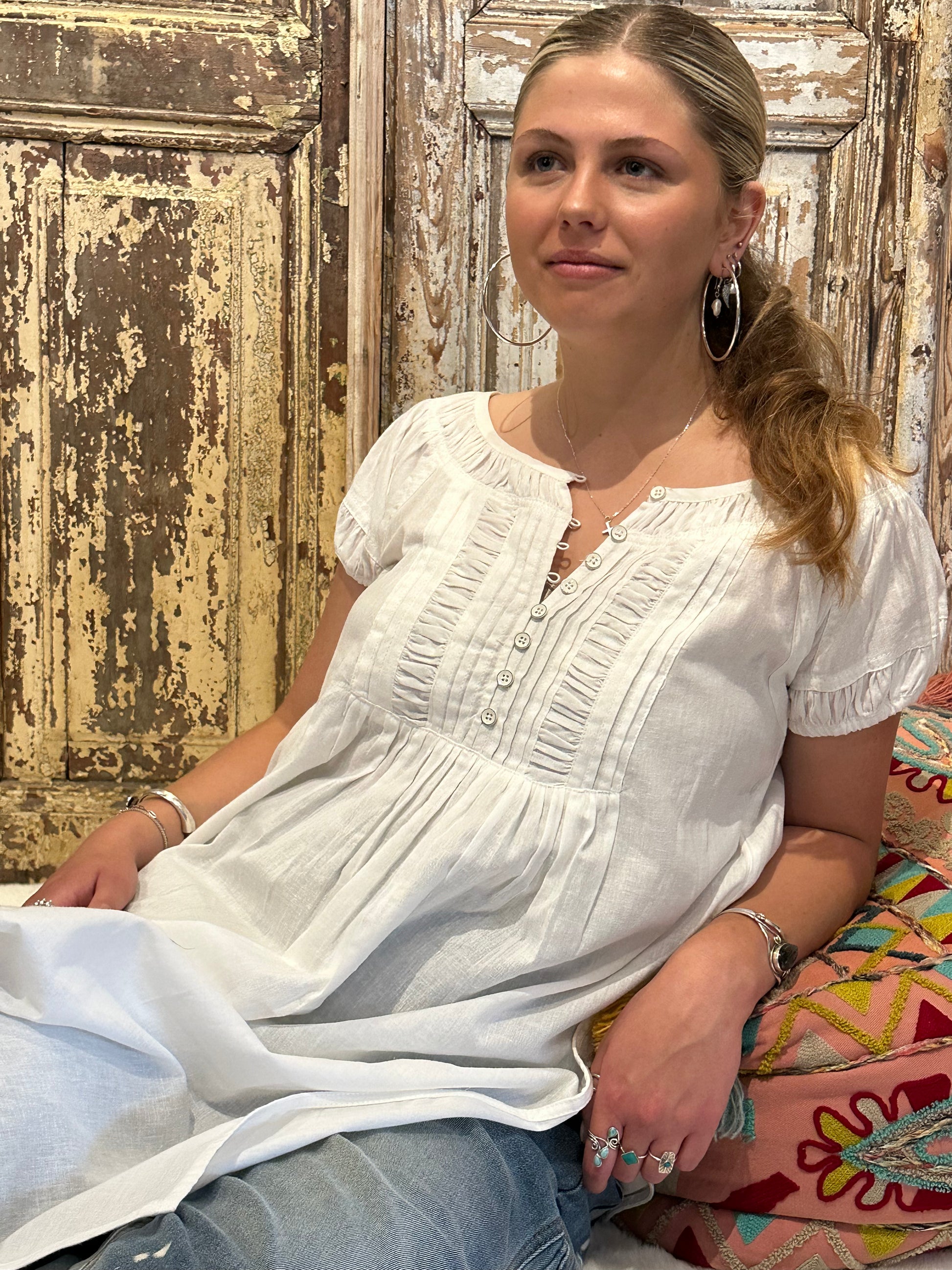 We’re obsessed with how versatile this top is—style it with wide-leg pants for a floaty daytime look, or wear it open over denim shorts or a girly lace slip for a romantic layered outfit. Side pockets add a practical touch, and capped sleeves keep it cool and classic.