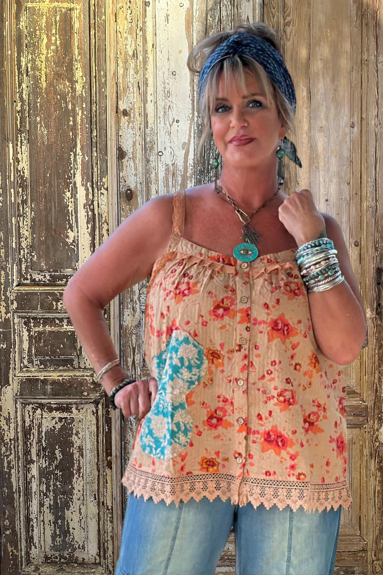 Breathe new life into your wardrobe with the Field of Flowers Tank, a vintage-inspired floral tank designed to add a punch of color and personality to your everyday looks. Featuring a patched front detail, delicate lace hem, and button-down front, this feminine yet funky piece is anything but ordinary.