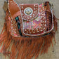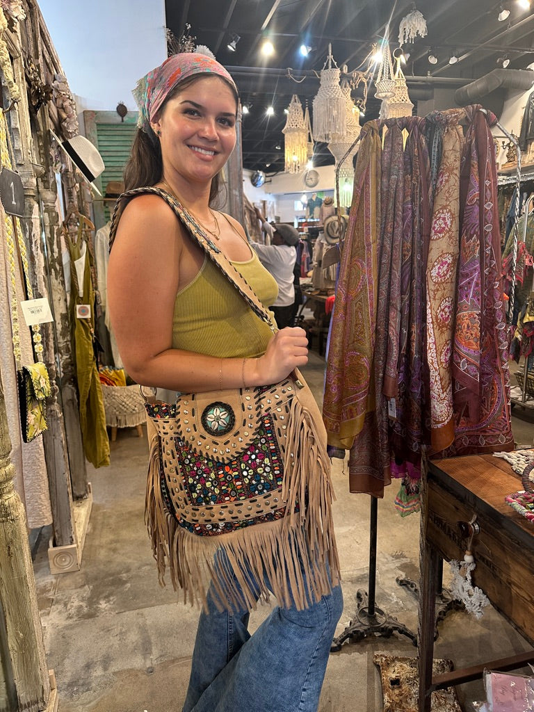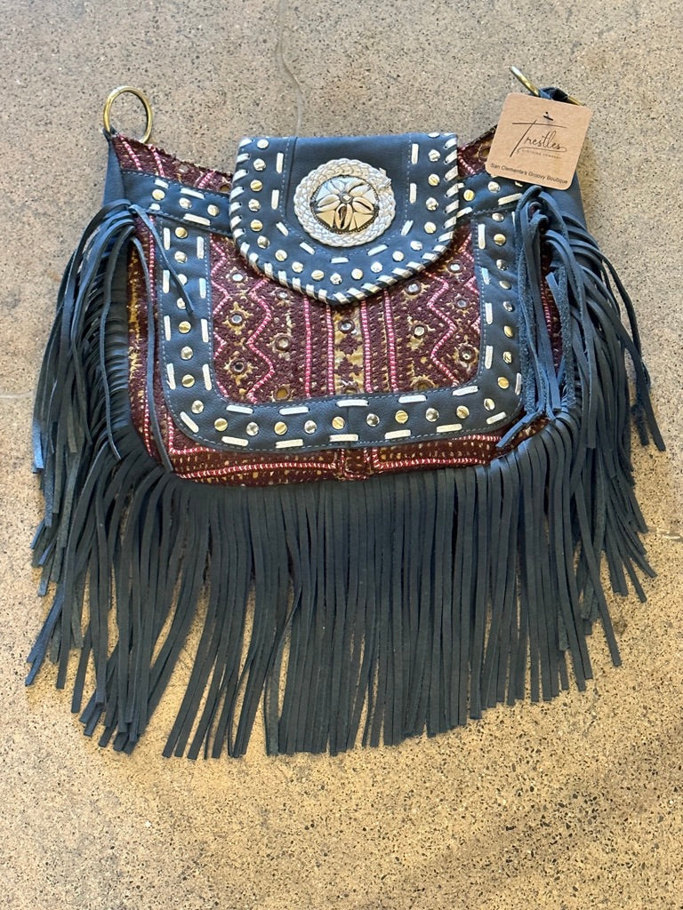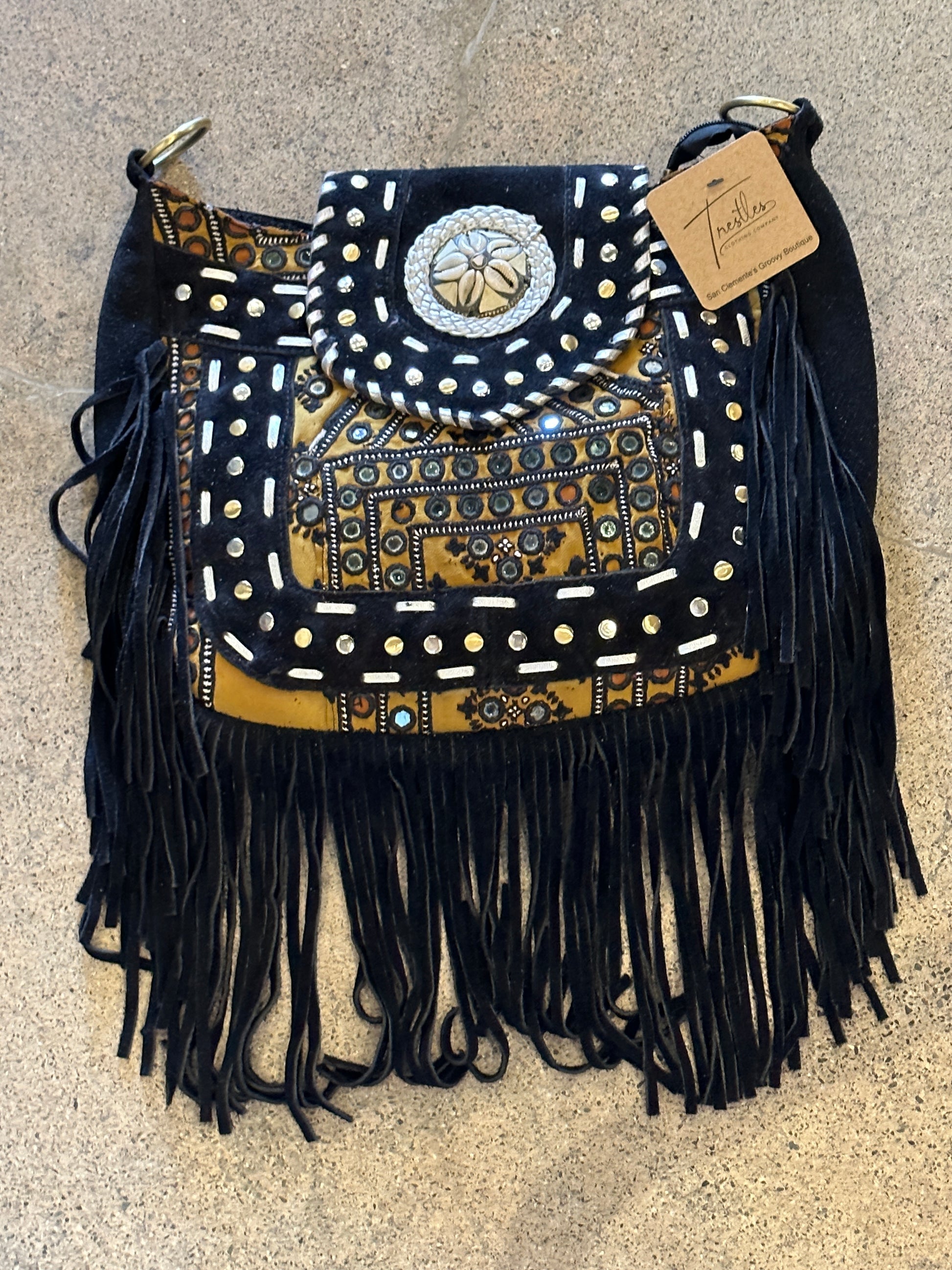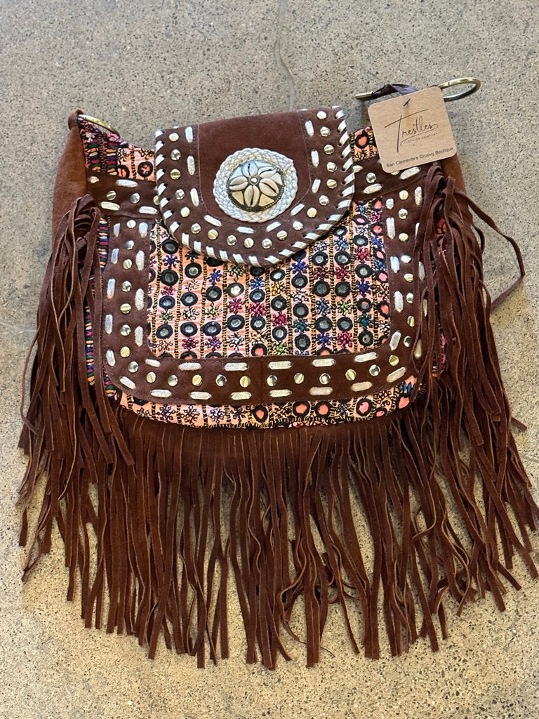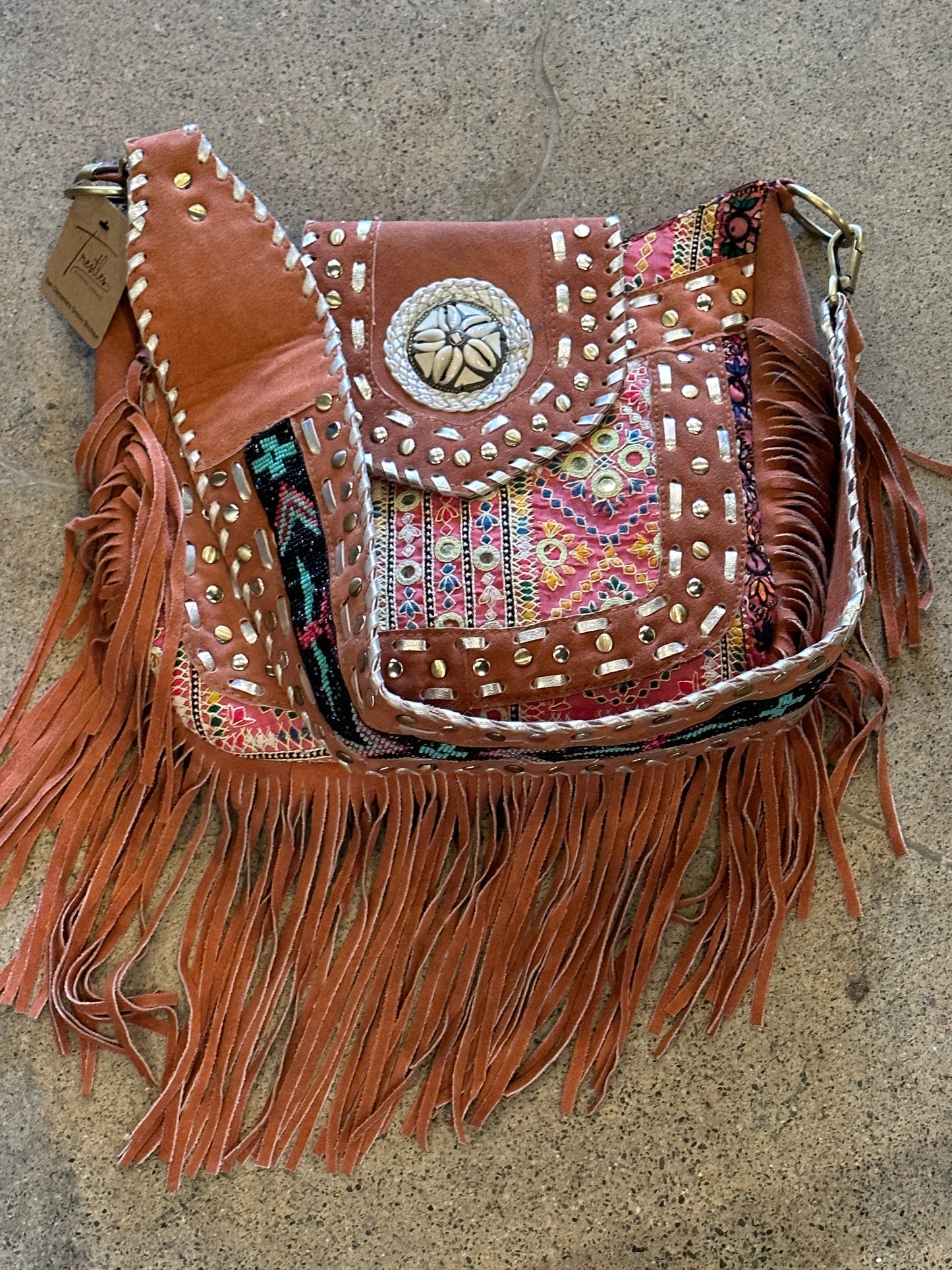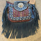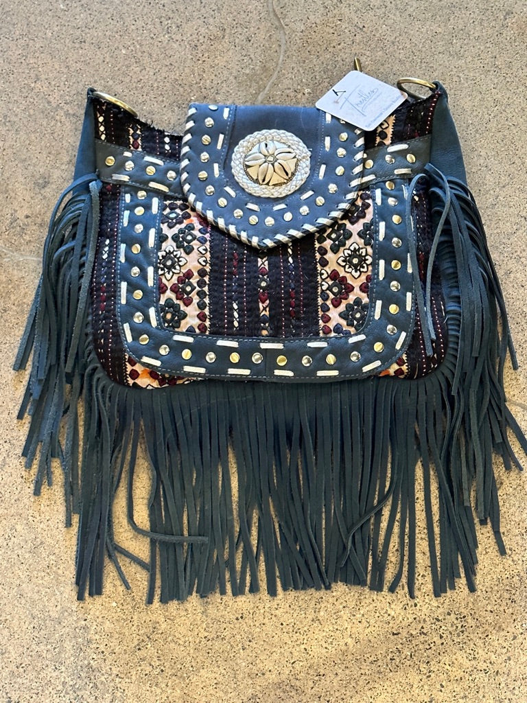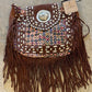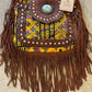 Stay ahead of the style curve with this one-of-a-kind Fringed Boho Leather Bag! It's handmade with an Indian fabric insert and features a zippered pocket inside and out, plus a magnetic closure for security. The boho and plain straps make it perfect for any occasion; there's no stopping you now!