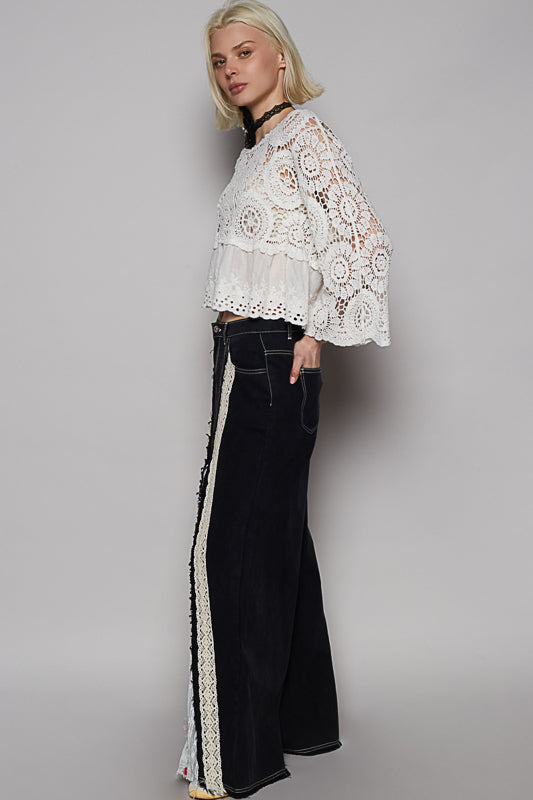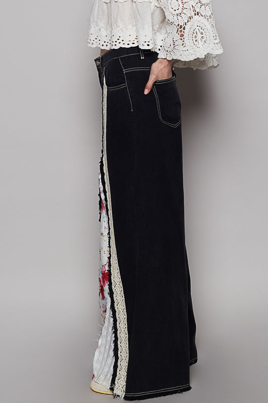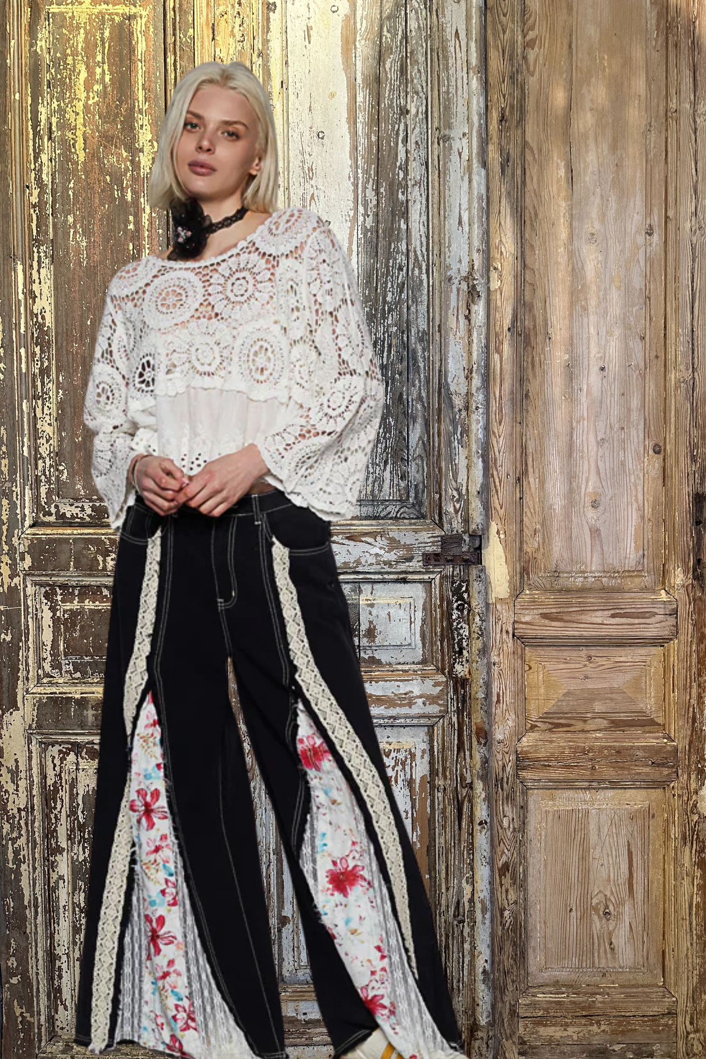 Featuring a comfy elastic waistband at the back and a lace ribbon detail up front, these pants blend comfort with vintage charm. The floral and lace inserts add the perfect touch of bohemian magic, turning a simple silhouette into a total showstopper.