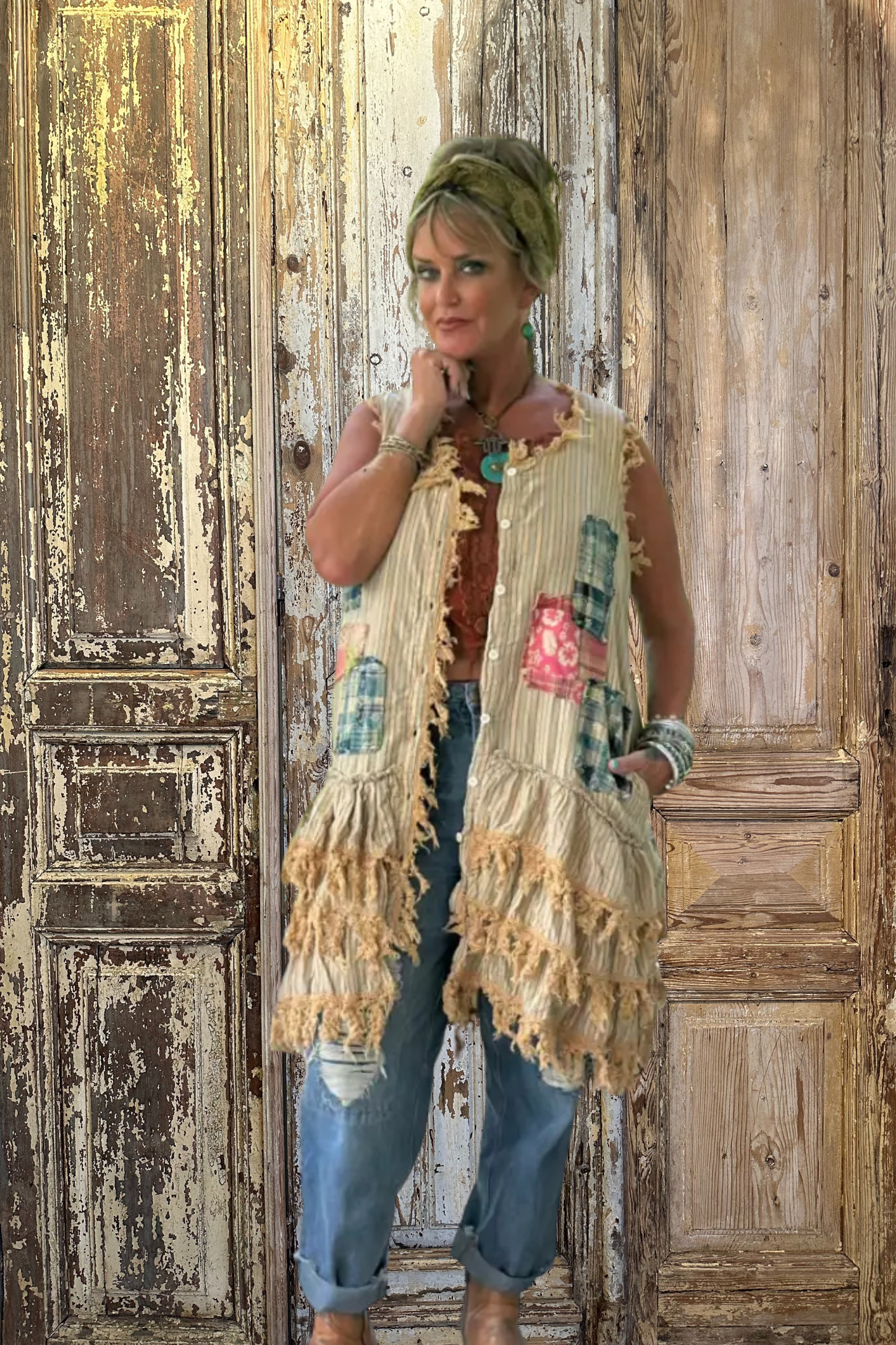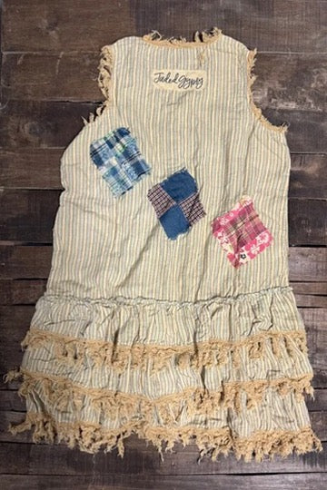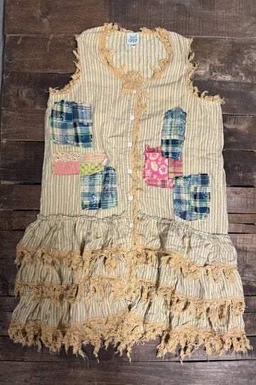 Made from 100% cotton, this sleeveless midi-length duster features random patchwork designs on the front and back, layered ruffles with cotton lace edging, and front buttons for easy styling. Throw it over jeans and a tee, a simple dress, or your favorite flares — instantly it goes from ordinary to “whoa, where did you get that?”