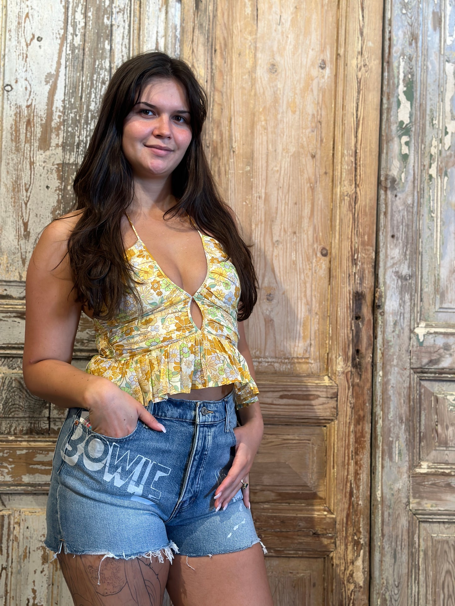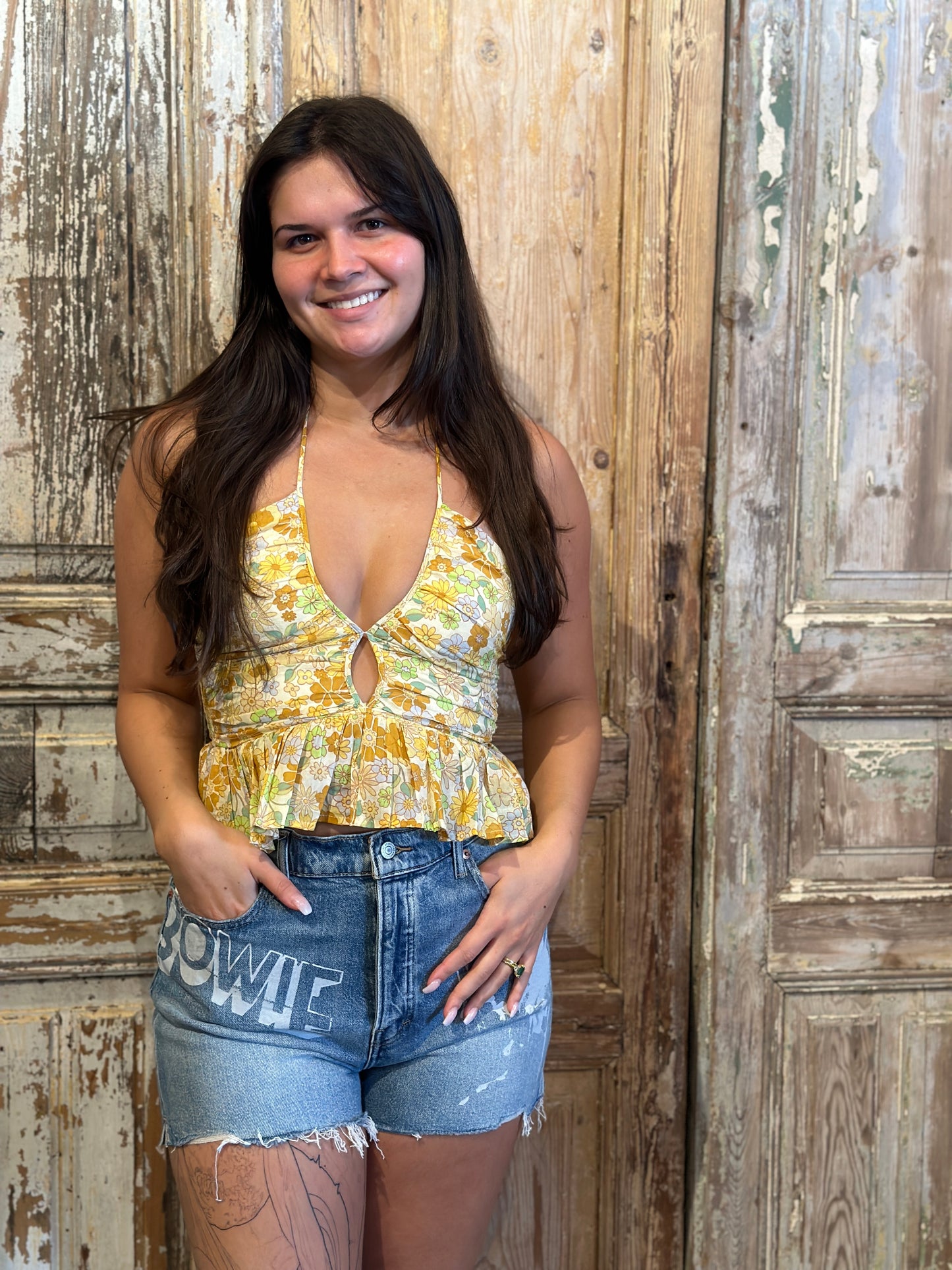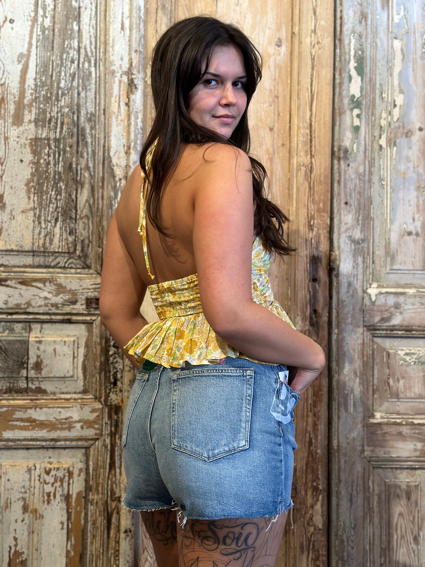 Show off your best angles in this v-neck halter Gold T Garden top! Featuring a smocked back and sweet peplum ruffle, this top is perfect for all the summer adventures you have planned! No matter what you get up to, you'll be the prettiest one in the garden!