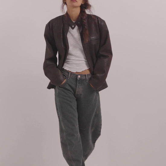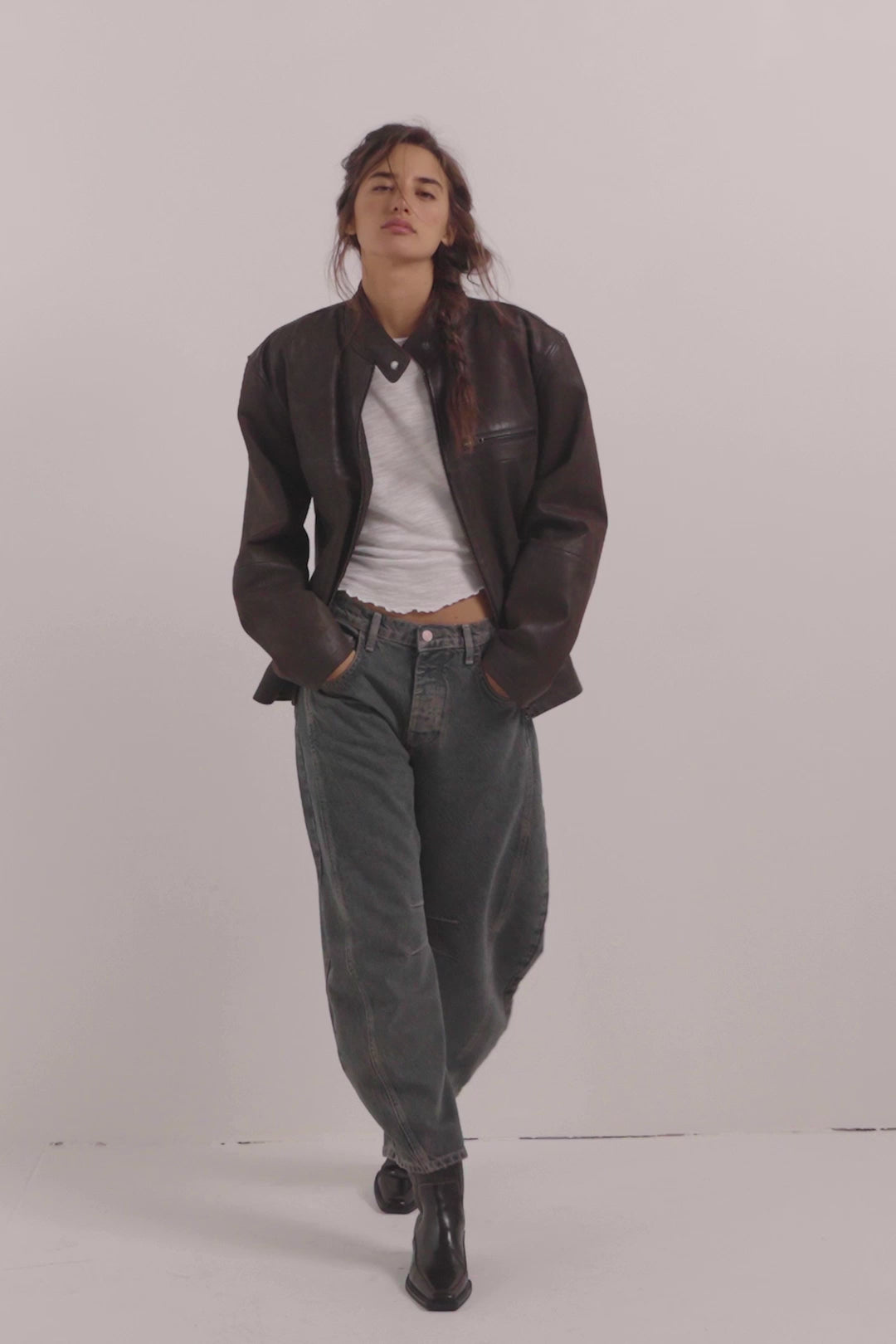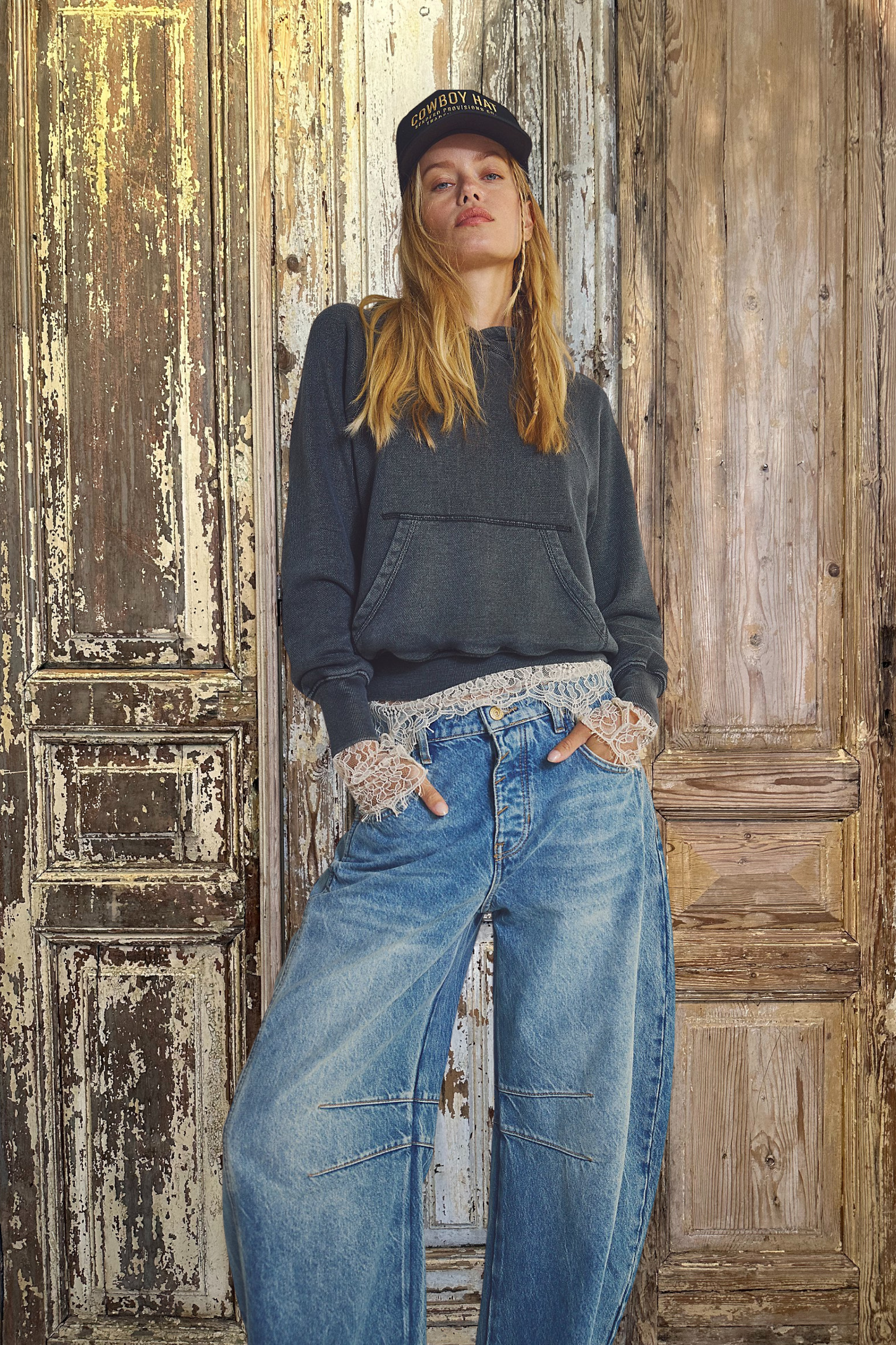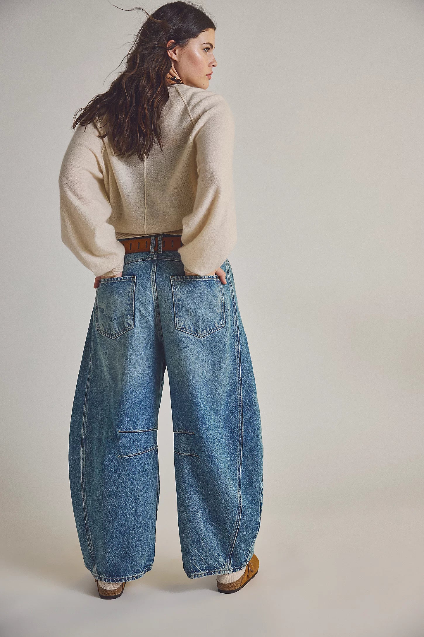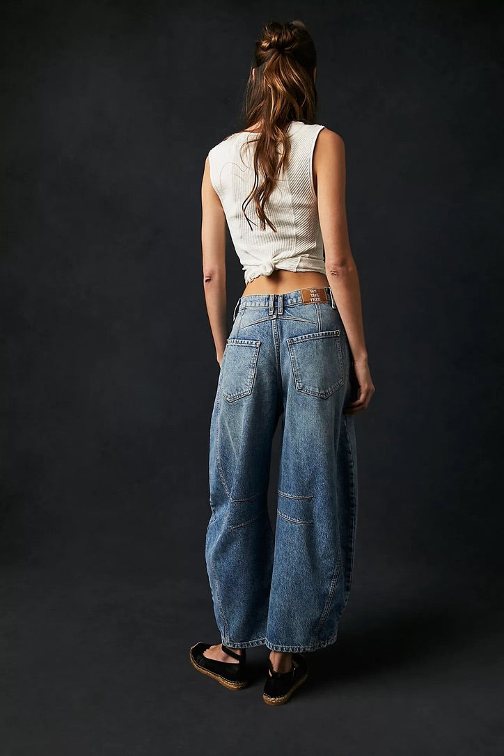 So bold barrel jeans featured in a mid-rise fit with subtle distressed detailing and wide-legs that taper at the ankle.