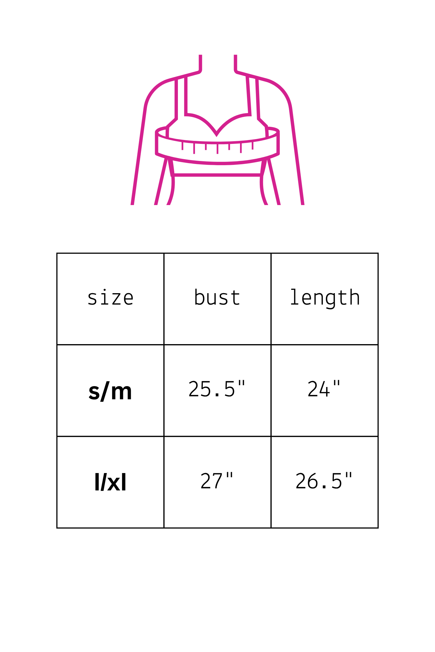 S/M: Shoulder 22.5" Bust 25.5" Length 24"