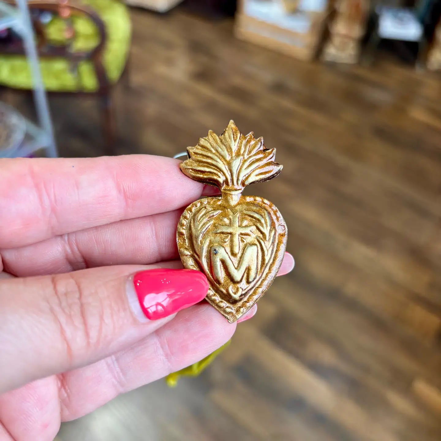✨ Add a soulful touch with the Small Round Sacred Heart Ornament — tin heart. Emblem on these beautiful Sacred Hearts represent "to Jesus through Mary". These are double sided and have a "bubble" look to them. Available in a variety of sizes. Handmade in India with a vintage-look finish, this piece can hang on your Christmas tree or be displayed year-round as boho home decor. Perfect for a wall accent, altar piece, or eclectic gift, it brings warmth, meaning, and timeless style to your space. 🌹🕊️