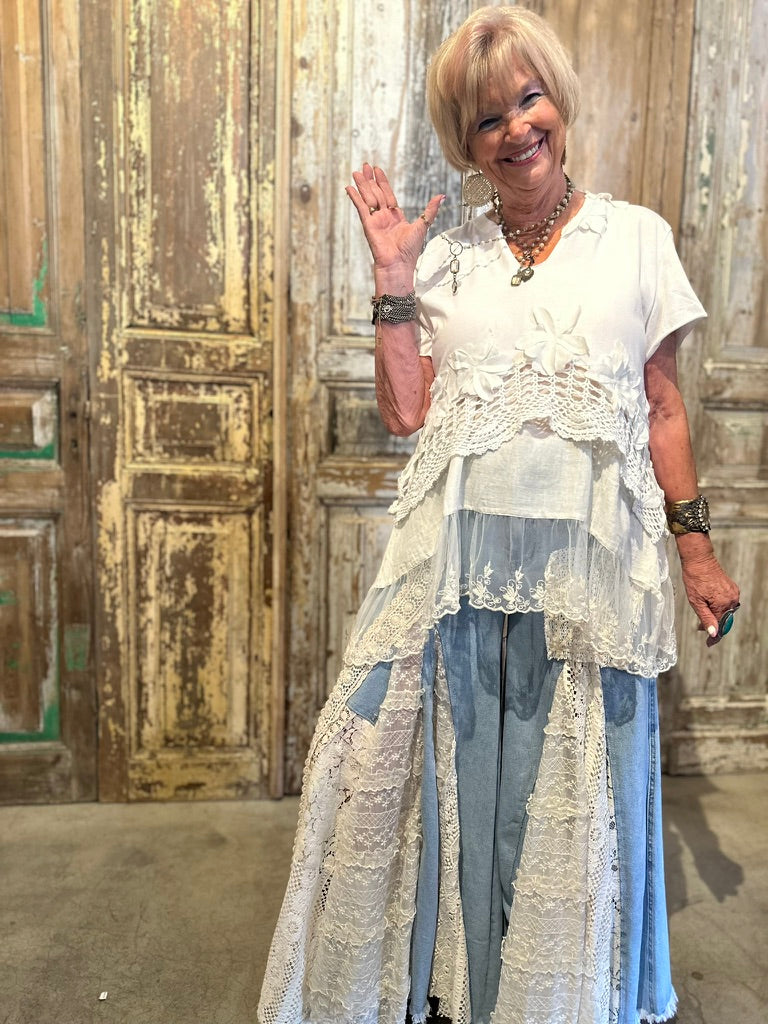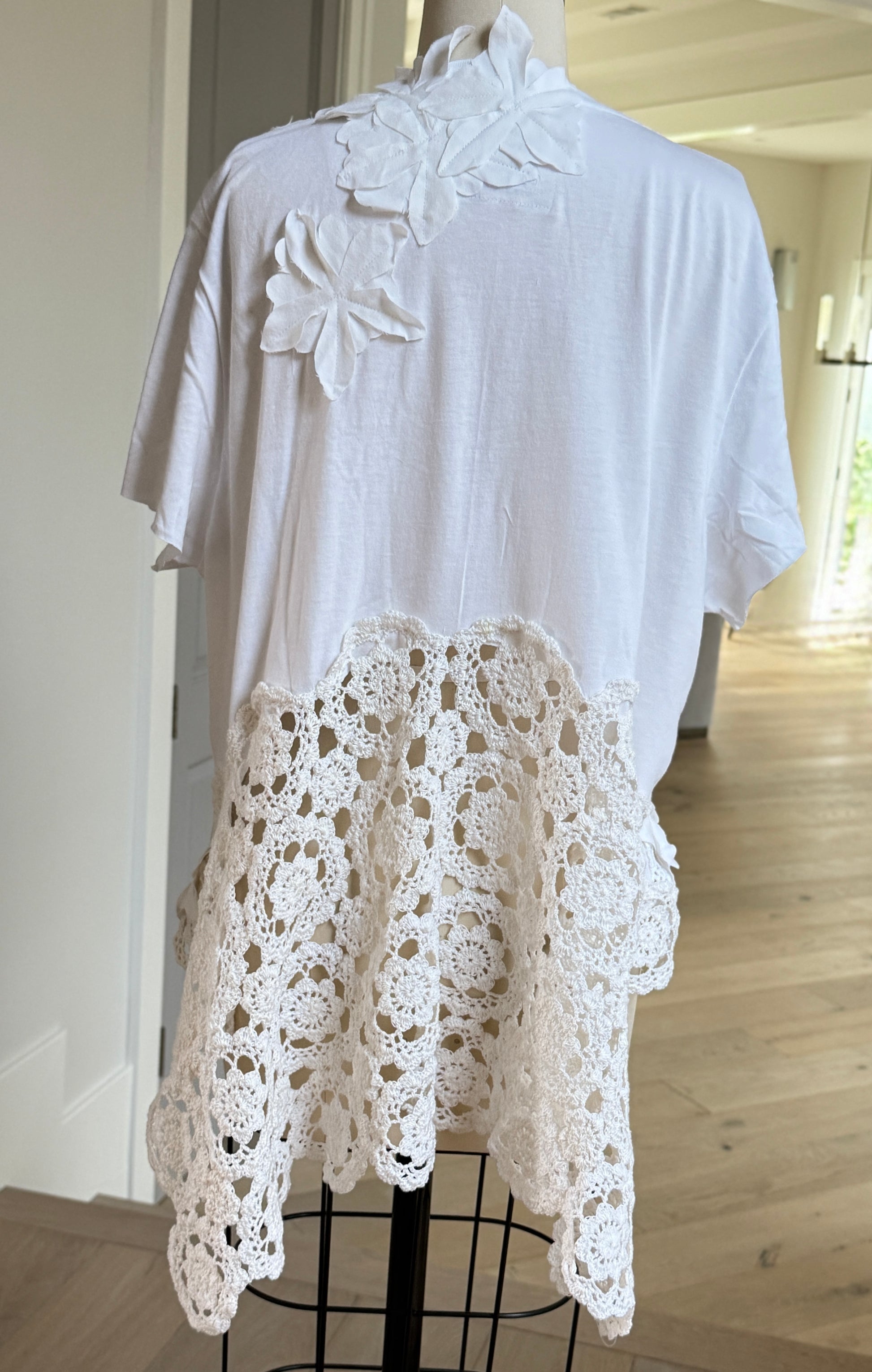 Say hello to the tee that got a second chance—and a whole lot of love. The Up Cycled Crochet Tee started as a gently worn men’s white tee, rescued and reinvented by Aileen with her signature funky-boho magic. She gave it a raw V-cut neckline, shortened the sleeves, and transformed it into a feminine statement piece using vintage crochet lace from an old tablecloth and hand-cut flower details on the front and back.