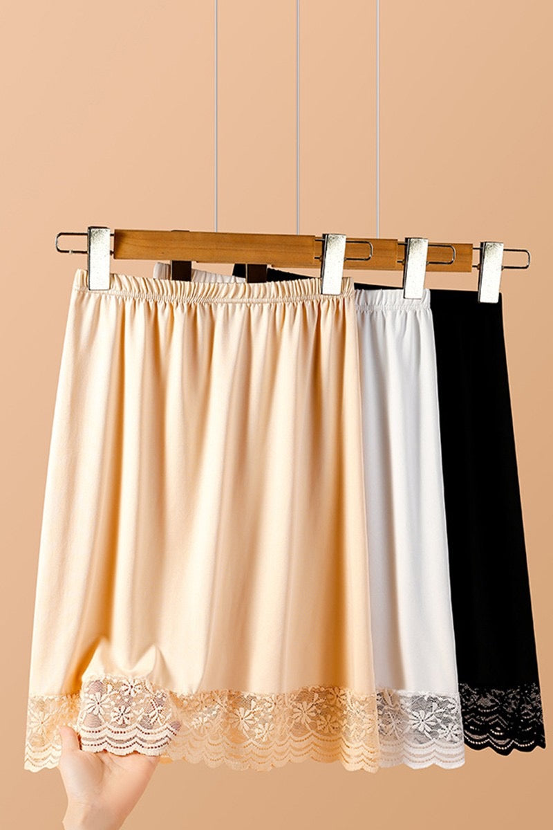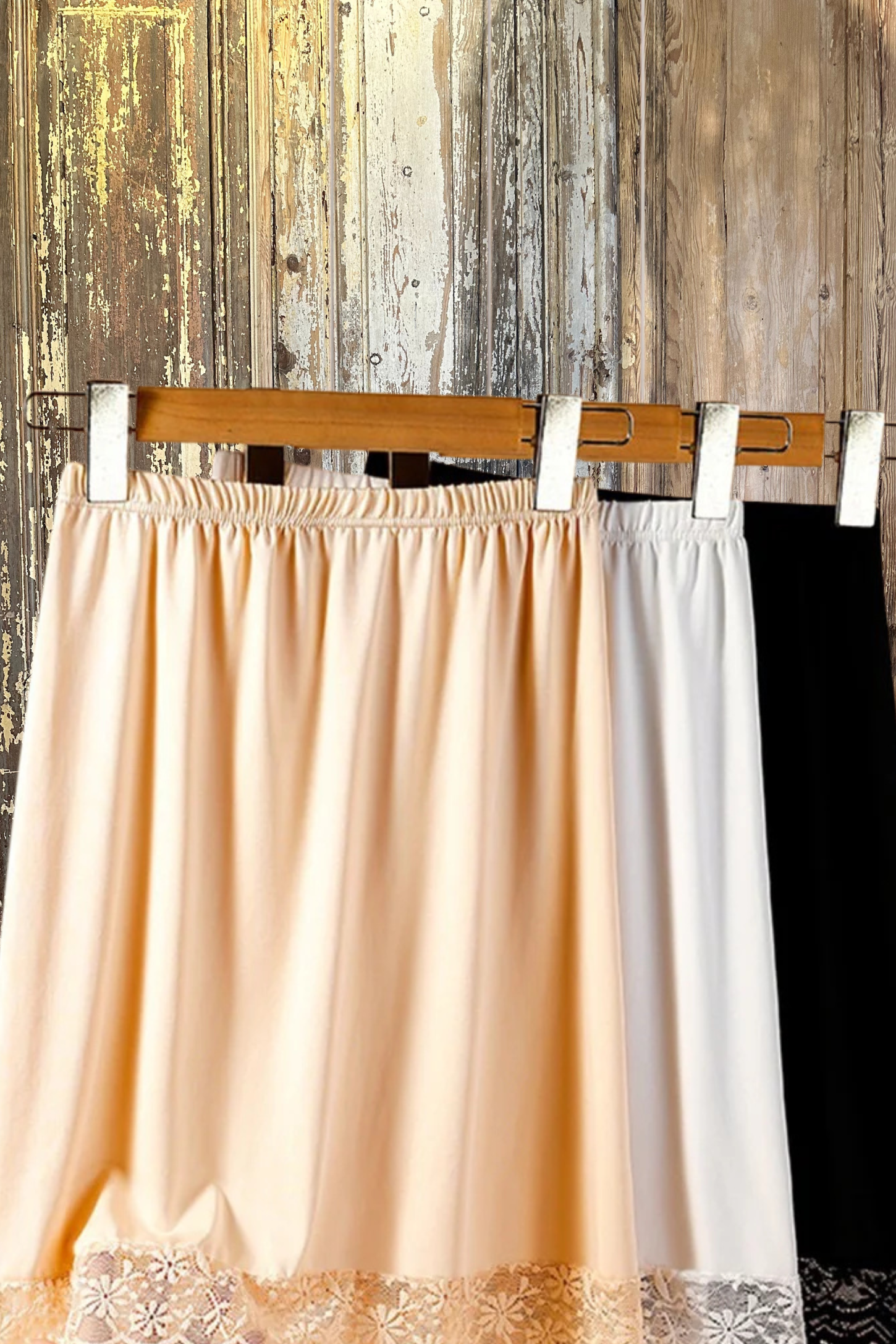 Cute midi length lace edge slips to wear under our tunics or when you want to add a romantic edge to our Poetic Dresses.  Elastic waist.