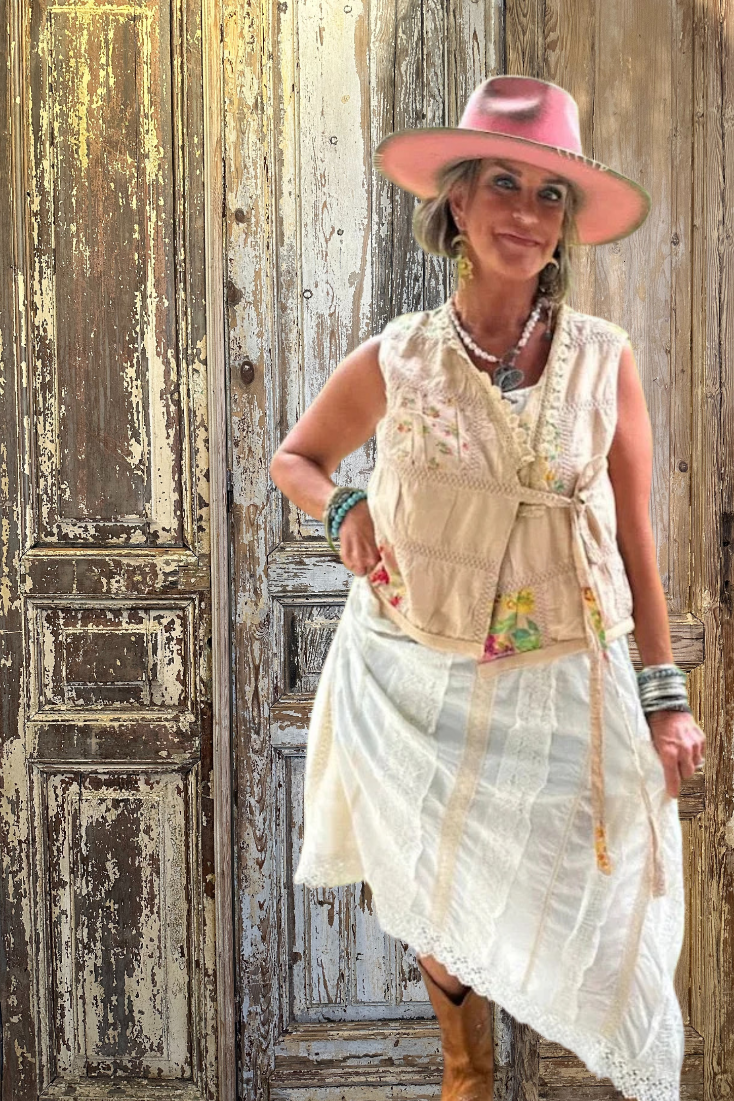 For a touch of feminine charm, this wrap top or vest features a colorful patch and lace details. Perfect for layering over simple cotton dresses. Get wrapped in love and style with this unique piece.