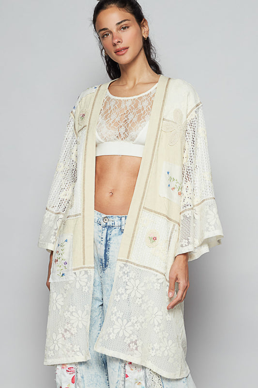 Lacey Patched Kimono – Oversized Gauze & Lace Cardigan with Vintage-Inspired Embroidery
