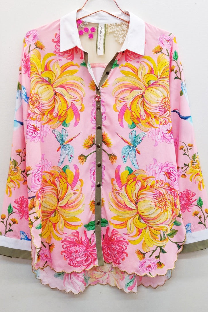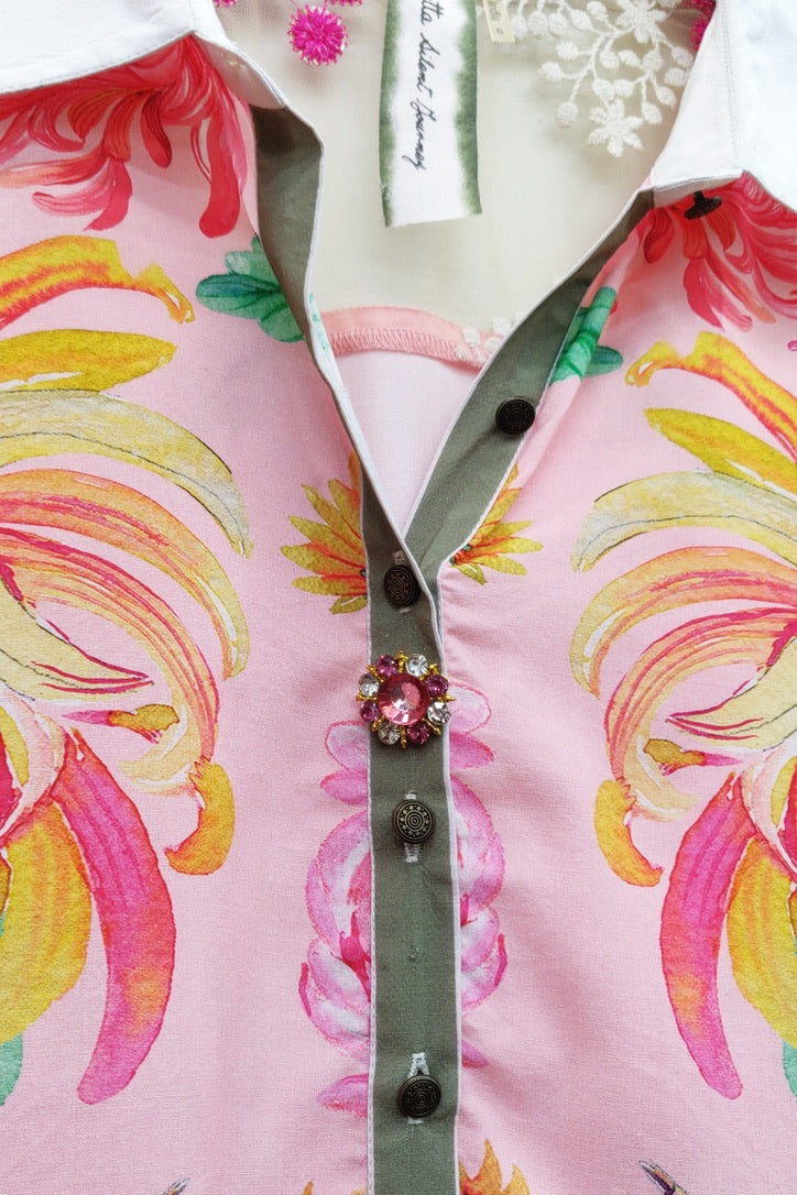 Elevate your style with the Legend of the Crane Blouse. This vibrant top boasts an artistic feel and stunning button detail. Dress it up or down for endless possibilities.