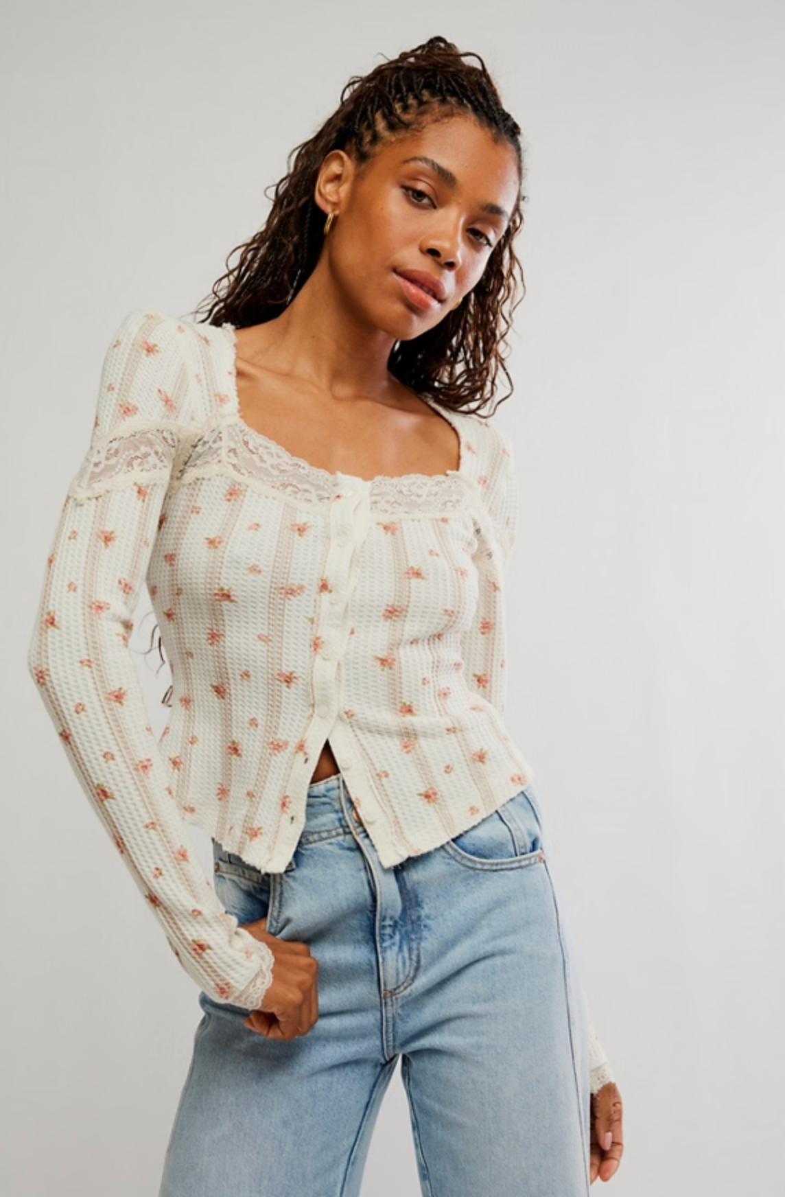 Sweet, soft, and just the right amount of vintage-femme. The Let’s Party Cardi is crafted in a cozy waffle-knit cotton with delicate lace trim details that elevate this everyday layer into something truly special. The square neckline adds a romantic touch, while the small floral print keeps it feeling timeless and easy to wear. Designed with long, fitted sleeves and a classic button-front closure, this cardigan is perfect worn on its own or layered over slips, tanks, and dresses for that effortlessly pretty, lived-in look.