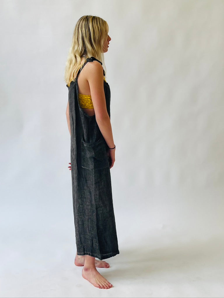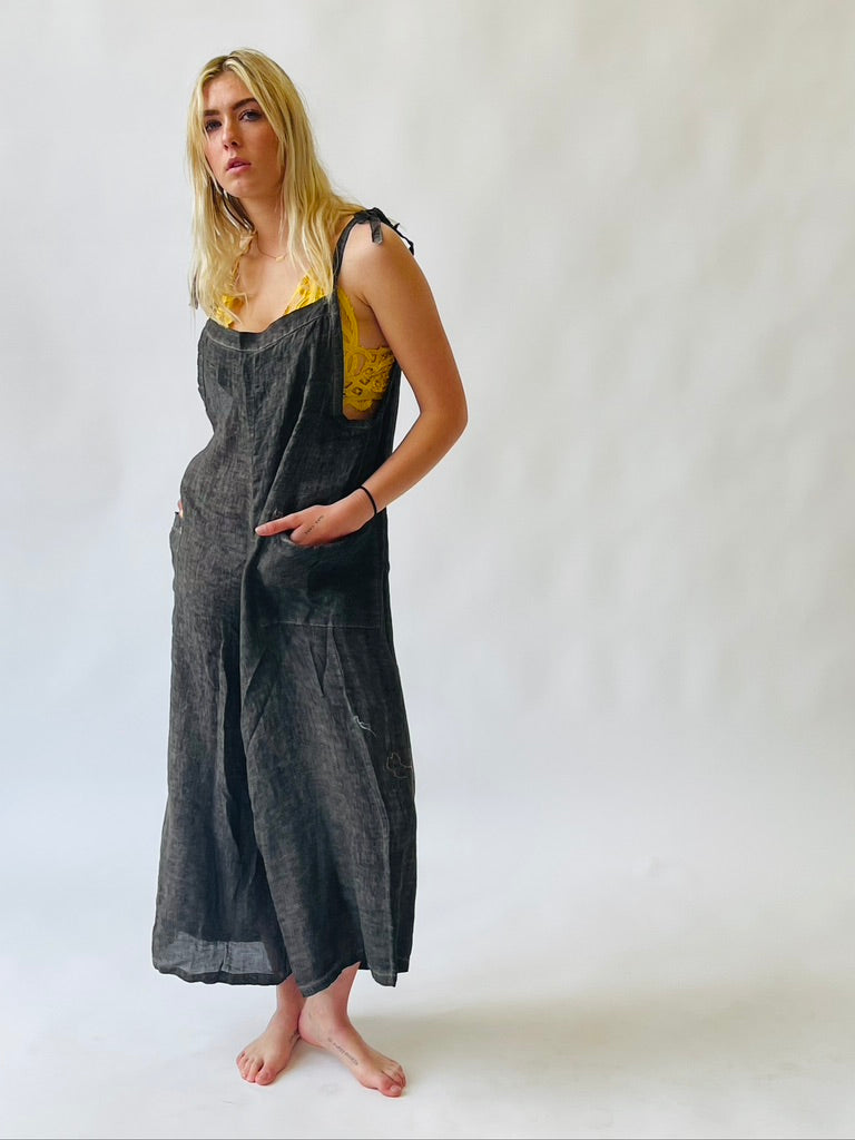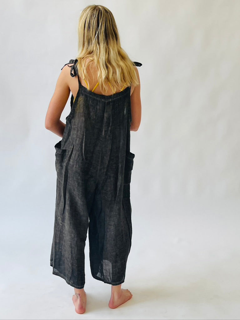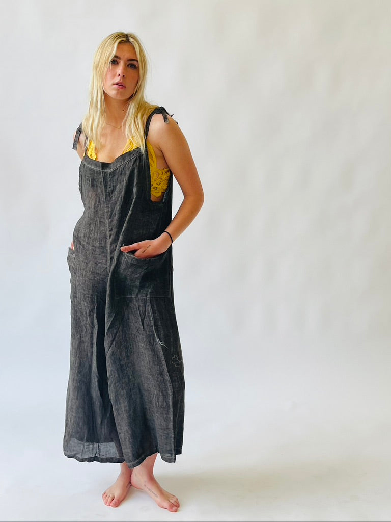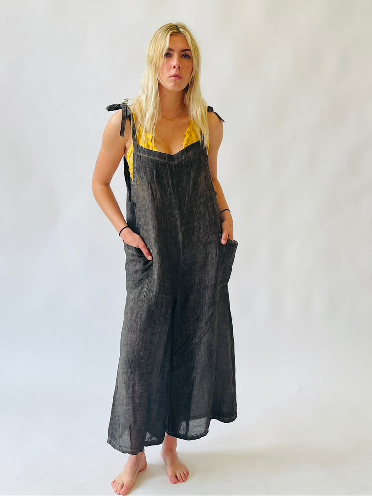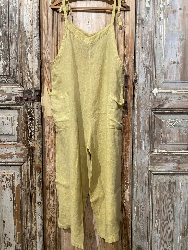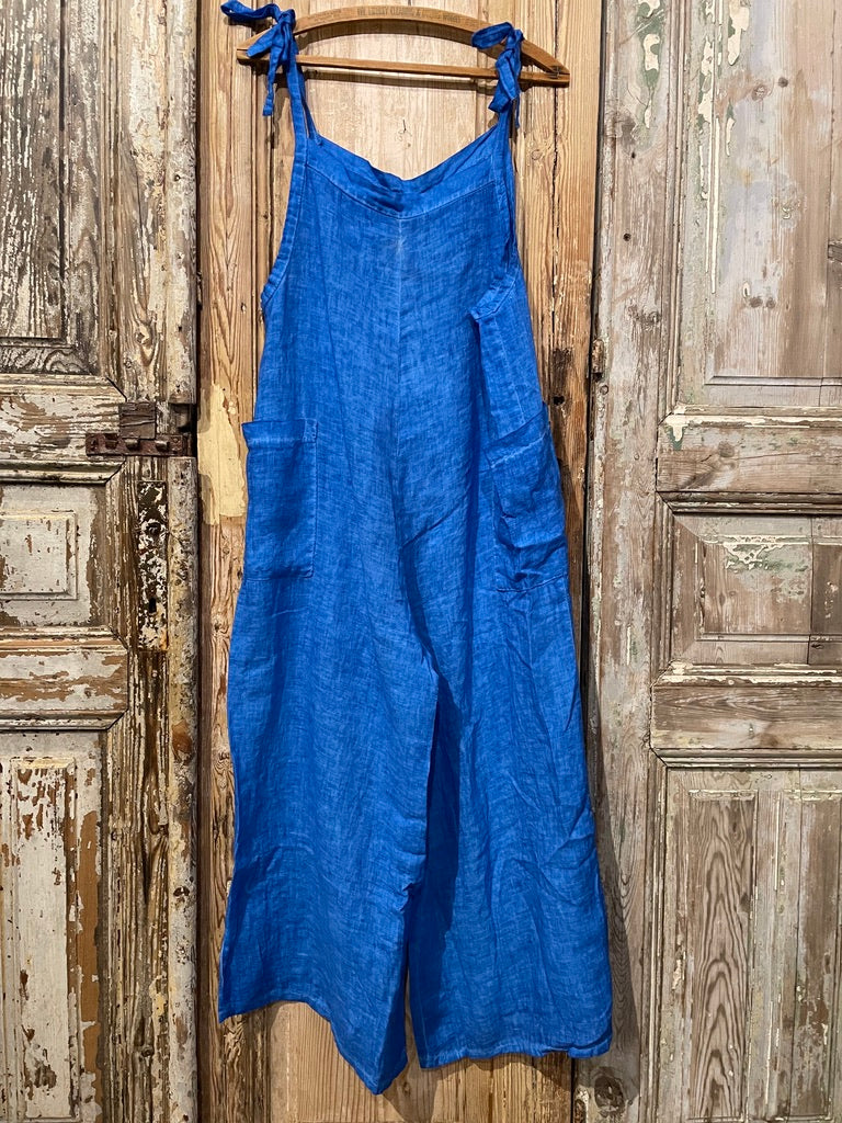 Our 100% Linen Overalls made in Italy are loose fit, one size,  & cropped.  The easiest throw on with any tee that will make you look like you just stepped out of a French marketplace!  Adjustable straps and loose legs make these so comfy!  We love wearing a cropped fitted top underneath!