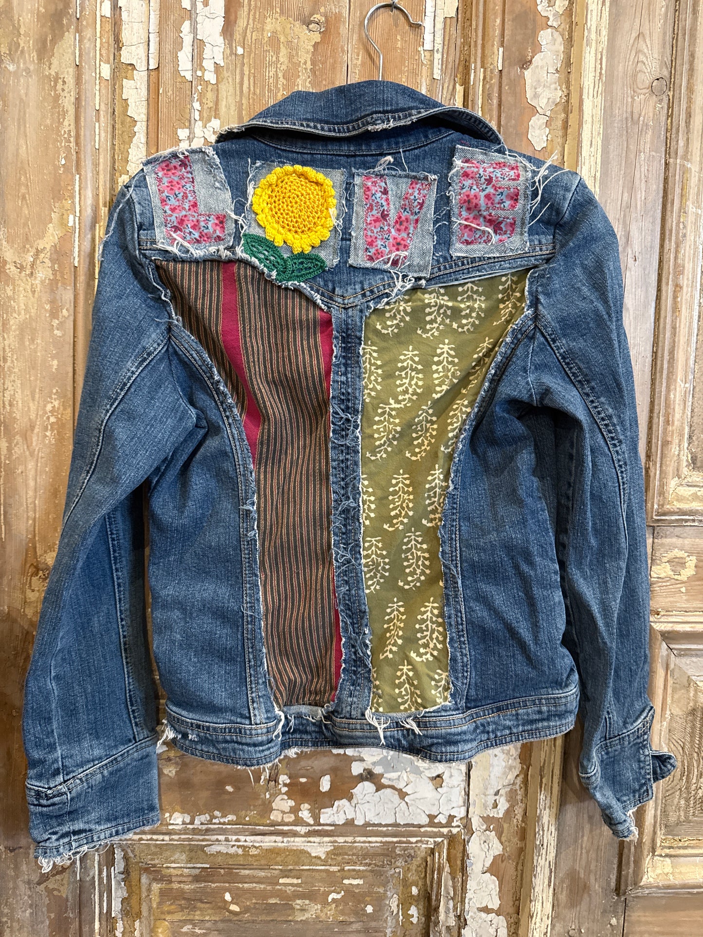 Unleash your inner ’70s free spirit with our Love 2-Tone Denim Jacket, a one-of-a-kind statement piece that looks like it came straight from a vintage hippie treasure chest. Featuring our signature LOVE patch on the back, this jacket is elevated with two-tone fabric from repurposed Indian dresses, making each piece truly unique. A peace sign applique on the front adds to its groovy, feel-good vibes, while the light distressing and front pockets keep it effortlessly cool and wearable.