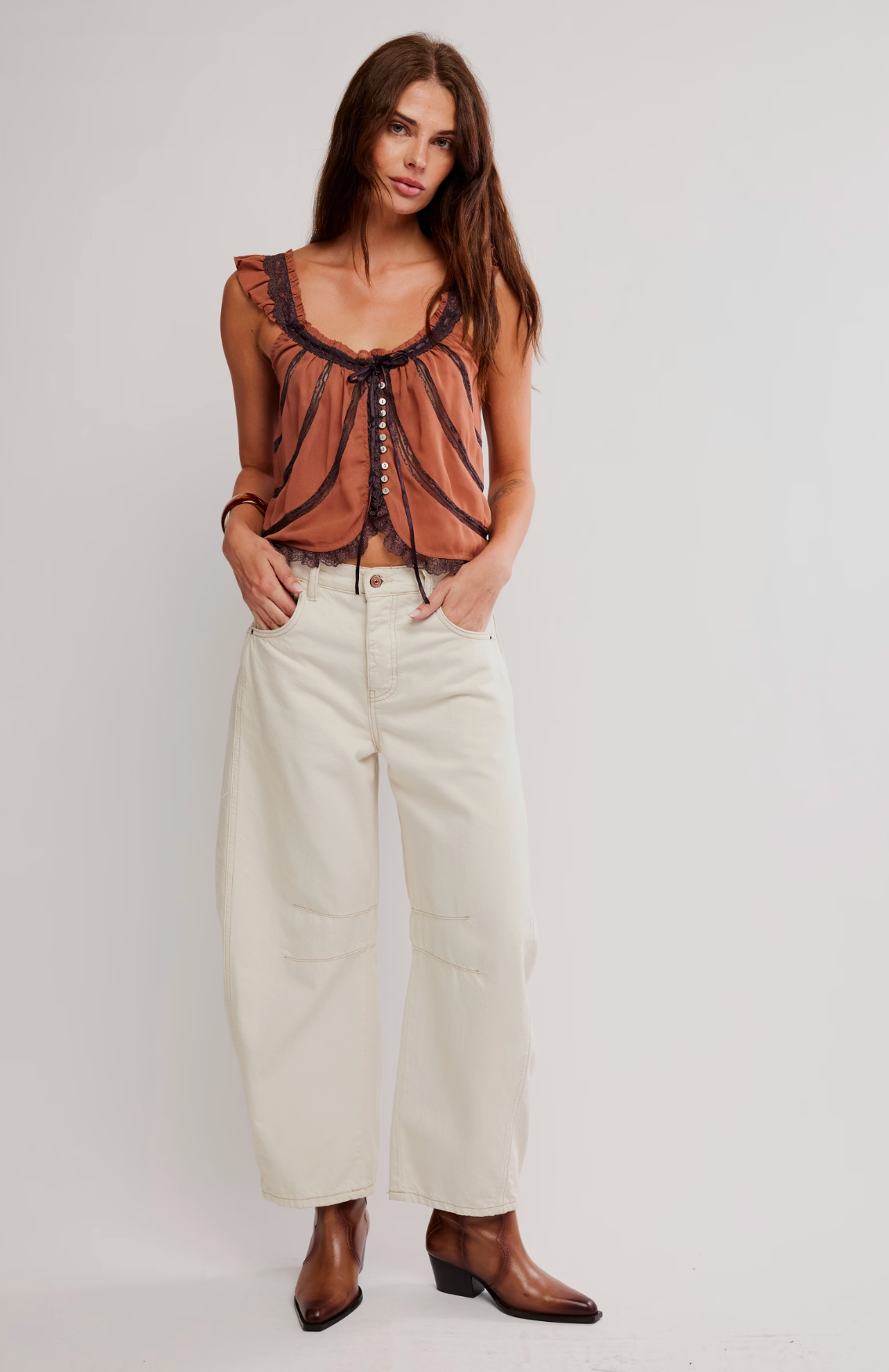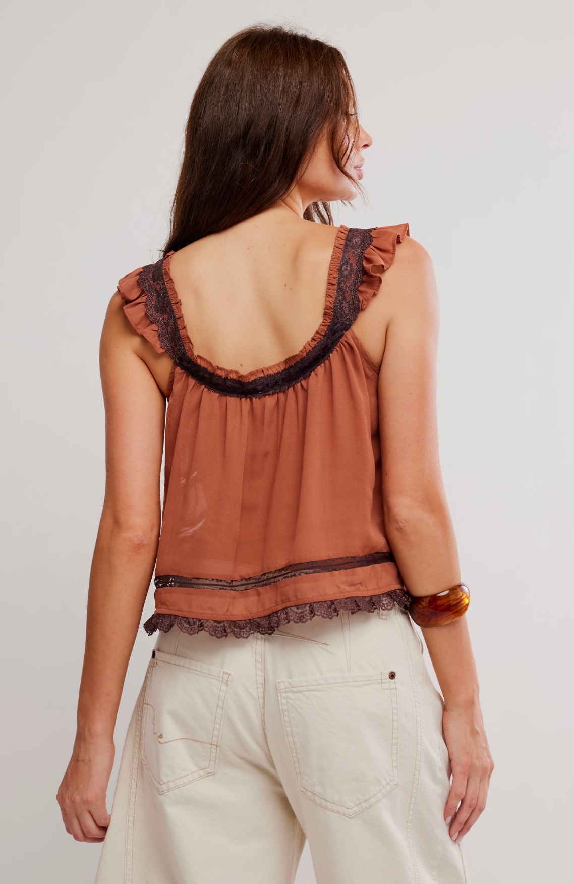 Soft, sweet, and forever femme 💕 The Mabel Tank by Free People brings vintage romance with delicate lace panels, ruffled trim, and a breezy, lightweight feel. Finished with a scoop neckline, button-front detail, and a dainty tie at the neck, this effortless tank is made for layering or wearing solo on warm, dreamy days.