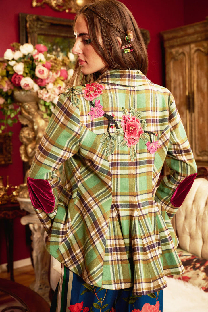Elevate your style with the Mc Queen Blazer. Featuring elegant embroidery on the front and back, luxurious velvet elbows, a fitted silhouette, a flared back, and stunning buttons, this blazer is perfect for any occasion. Dress it up or down for a chic look that will turn heads.