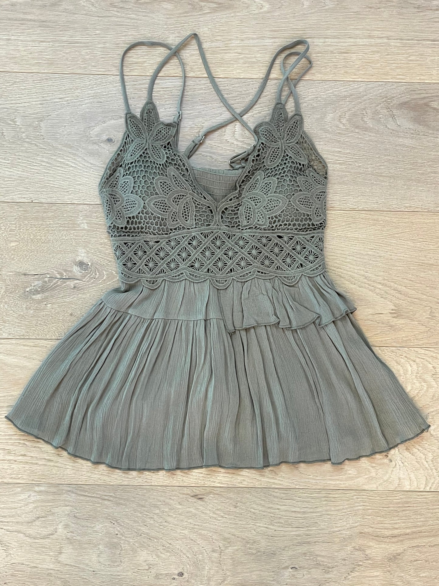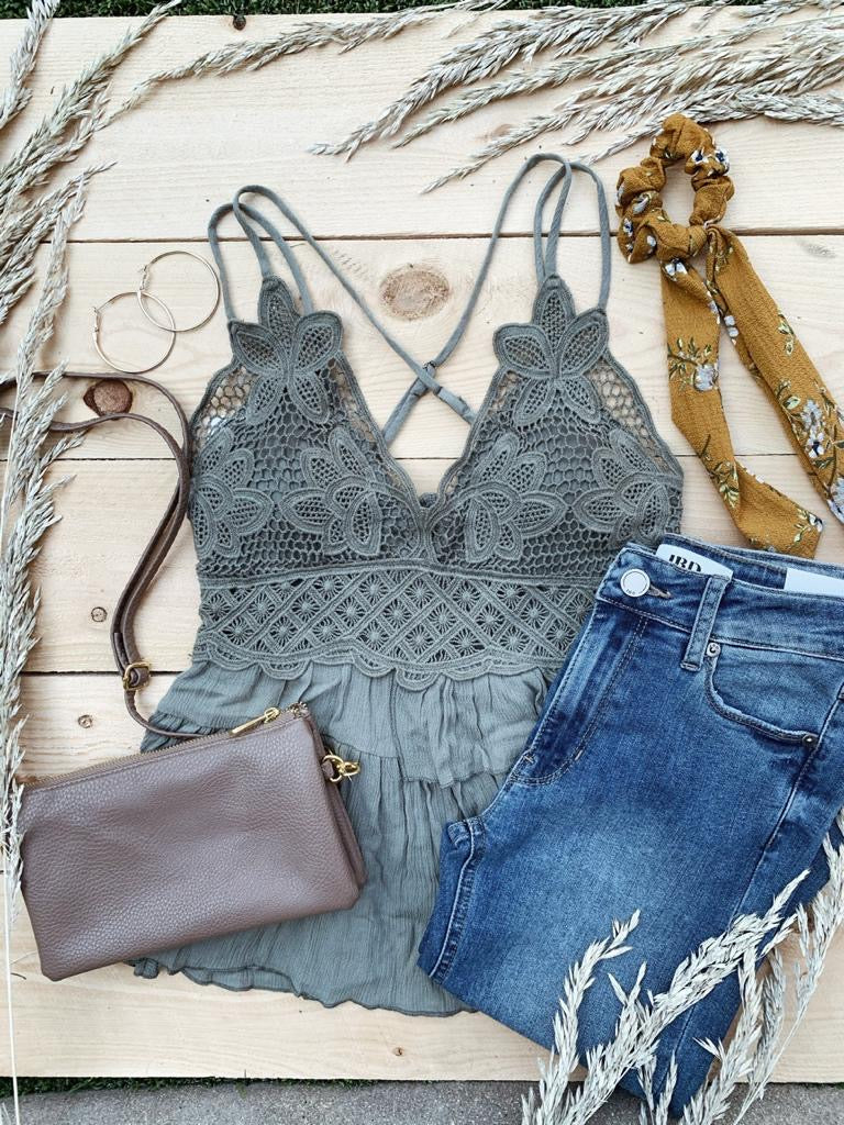 Fitted bralette top with adjustable double straps with tiered ruffles.  Looks cute with our boho patched skirts, jeans and with simple jean shorts. If you love our lace Bralettes or Melina dresses you'll love the Melina Top!  Unlike the other Melina Tops, the Sage, Dusty Coral & Mauve Melina Top runs longer and has less tiers of ruffles.  Dry Clean Only.