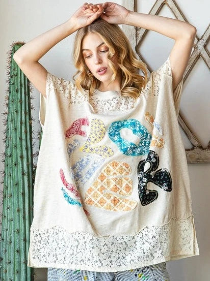 Short sleeves, peace word applique, lace detail oversized, and side pockets all combine to create a playful and fun look for any occasion.
