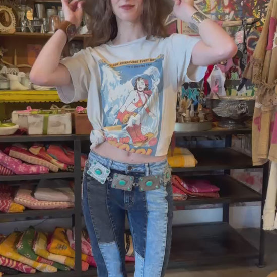 Step into effortless style with our Pieced Denim Flares – the ultimate mashup of cowgirl sass and hippie soul! These flares feature a striking light and dark pieced, color-blocked denim design that gives off major vintage vibes. The mineral-washed finish adds that worn-in, lived-in feel, while the relaxed fit and flared cut give you plenty of room to move – and show off your favorite boots.