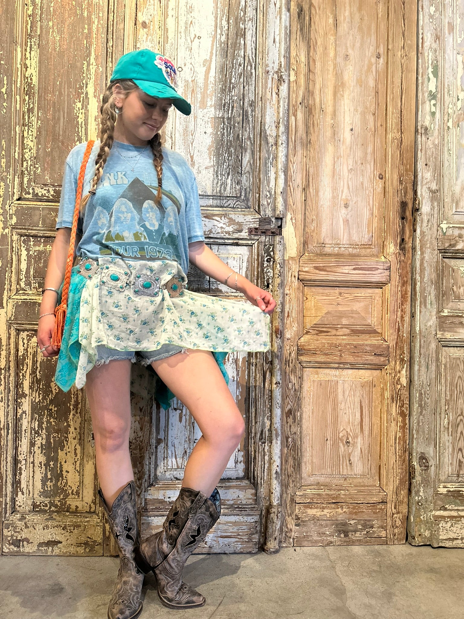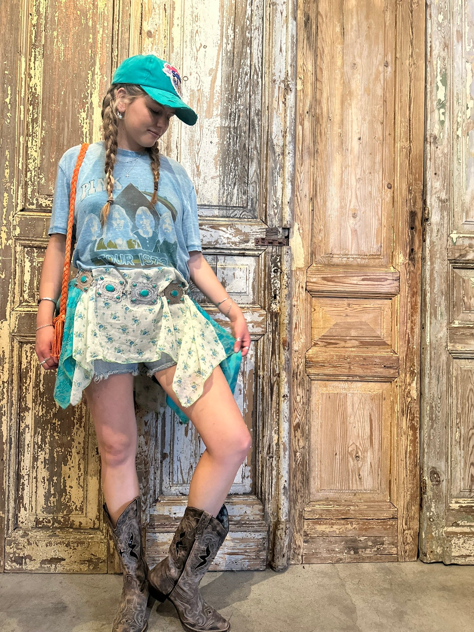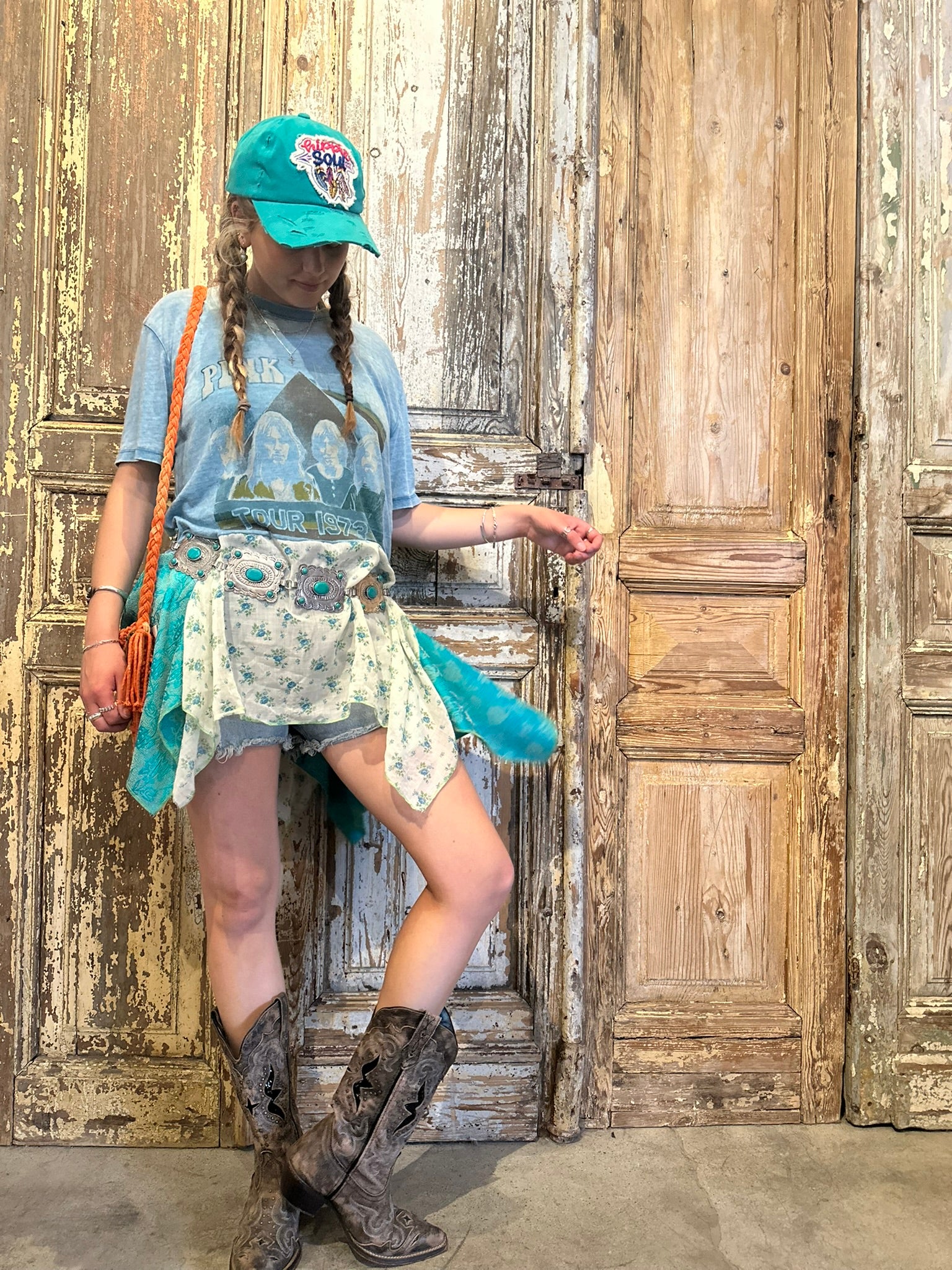 It’s loose-fitting, breezy, and perfect for warm days or layering up when the desert wind blows. We love styling it with our Boho Concho Belt (handmade and imported from India), Aileen’s up cycled Love Shorts, and recycled cowboy boots found deep in the heart of Texas.