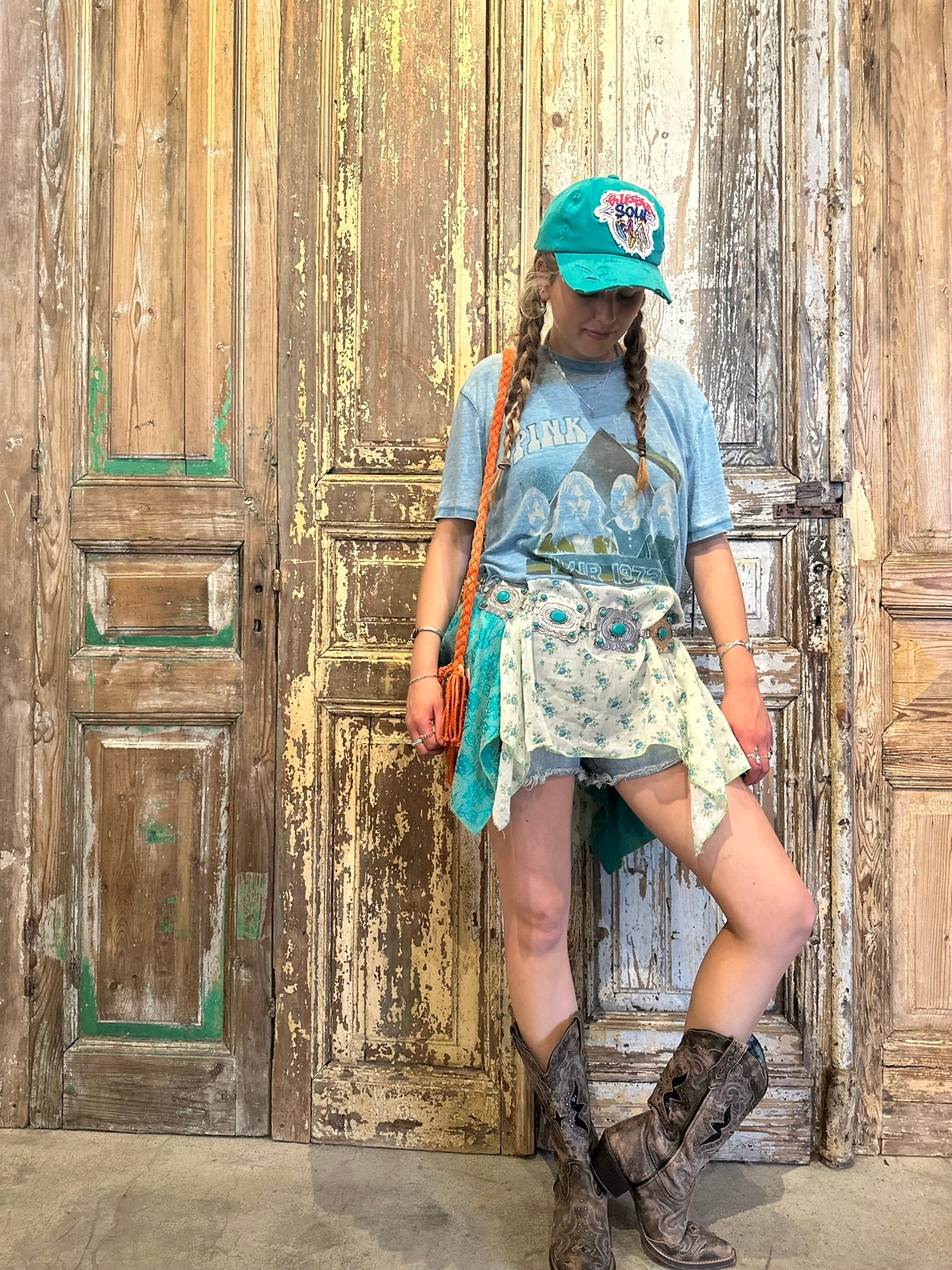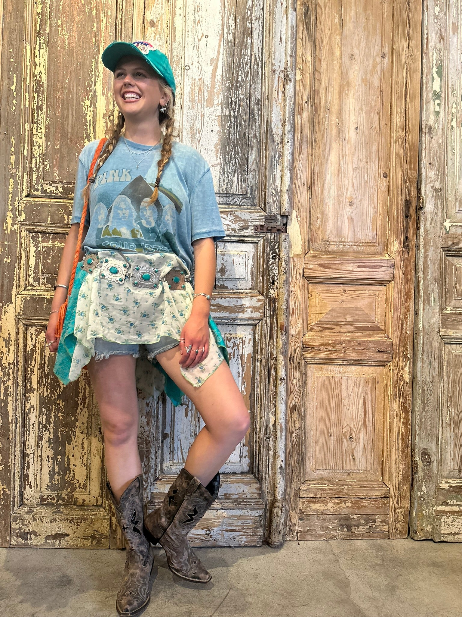 Turn heads and break the mold in our Up cycled Pink Floyd Tunic – a true statement piece straight from the soul of the boho underground. Created by Aileen using a thrifted burnout Pink Floyd tee and finished with hand-selected vintage fabrics, this tunic tells a story of rock ‘n’ roll, rebellion, and rebirth.