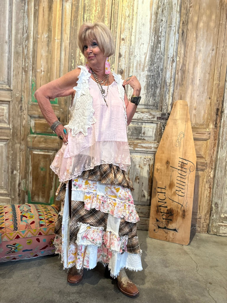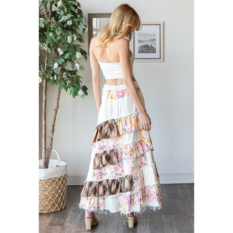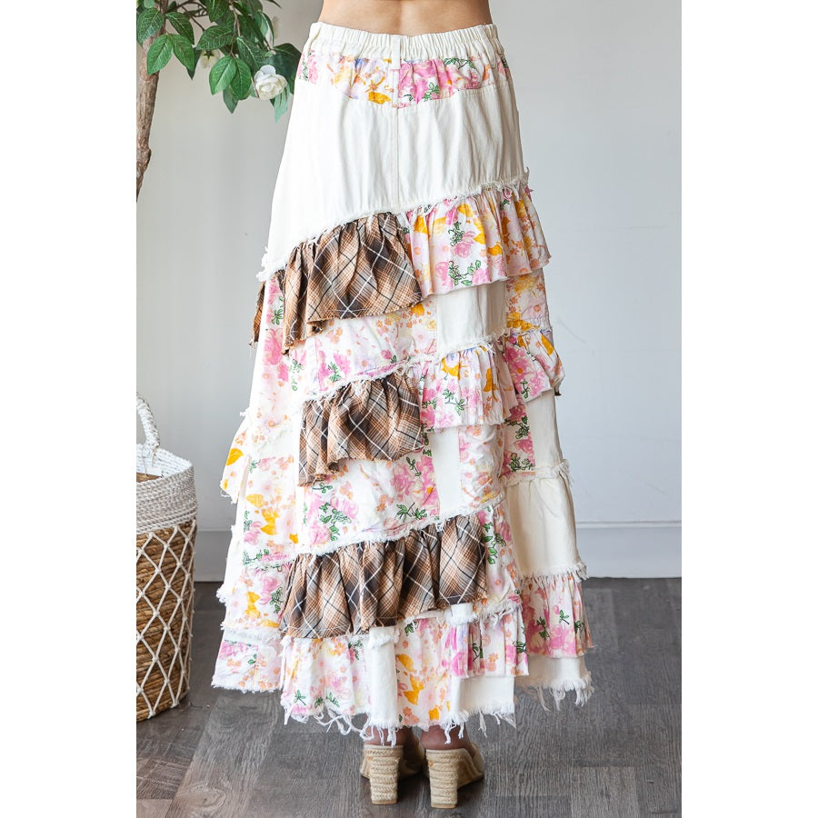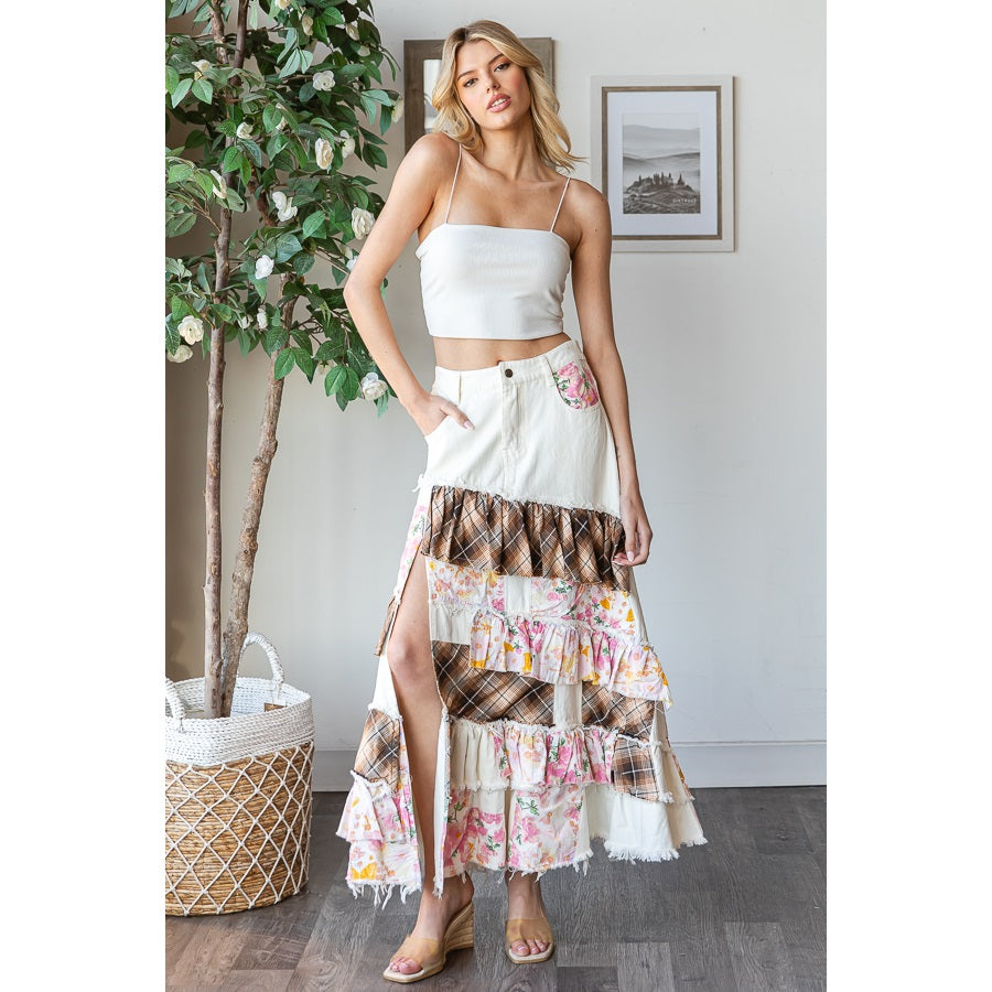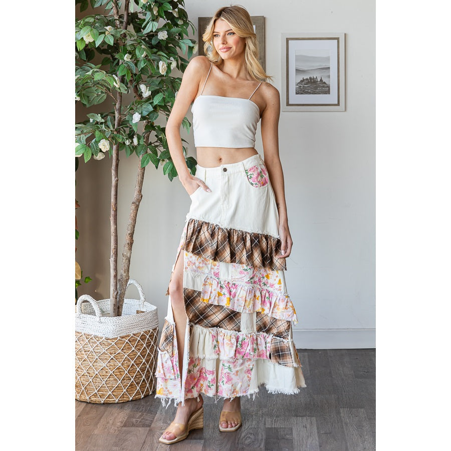 Ohhh, this skirt is pure magic, man! The elongating design flows like a dream, with that asymmetrical cut that mixes plaid and floral in the most free-spirited way. And let’s talk details—ruffles for that feminine touch, a raw hemline for that effortless edge, deep front pockets (because pockets in skirts are life), and a high-cut front slit that brings just the right amount of understated sexy.