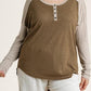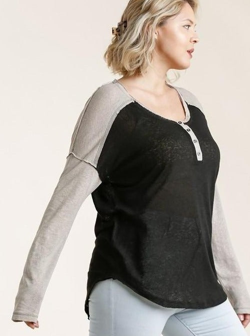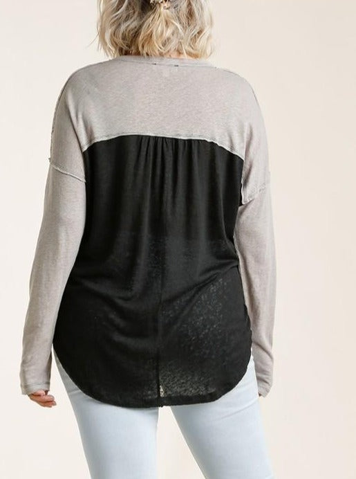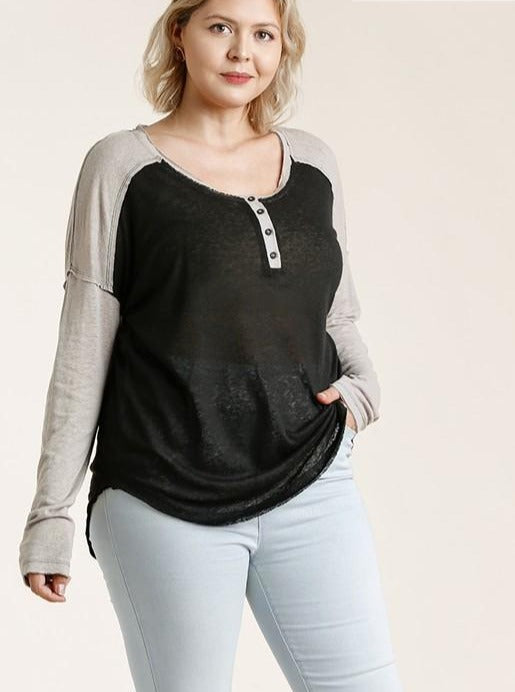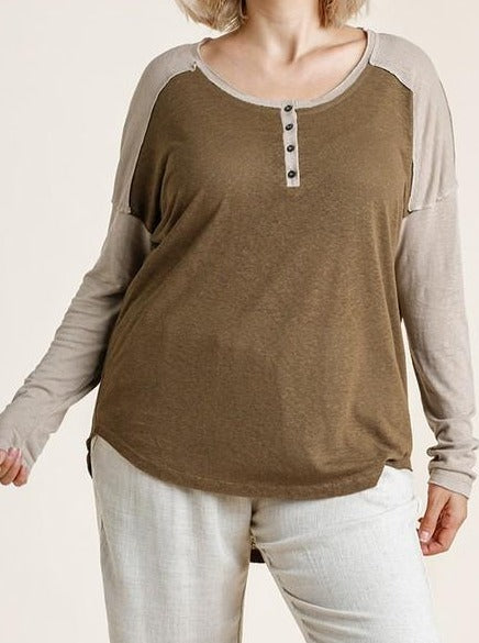 Comfortable Rachel Henley with front buttons and contrast front and back colors.  Super soft 57% linen 43% viscose.  Raw edge design, scoop.  We love the contrast colors to wear with jeans.  Only comes in plus size.