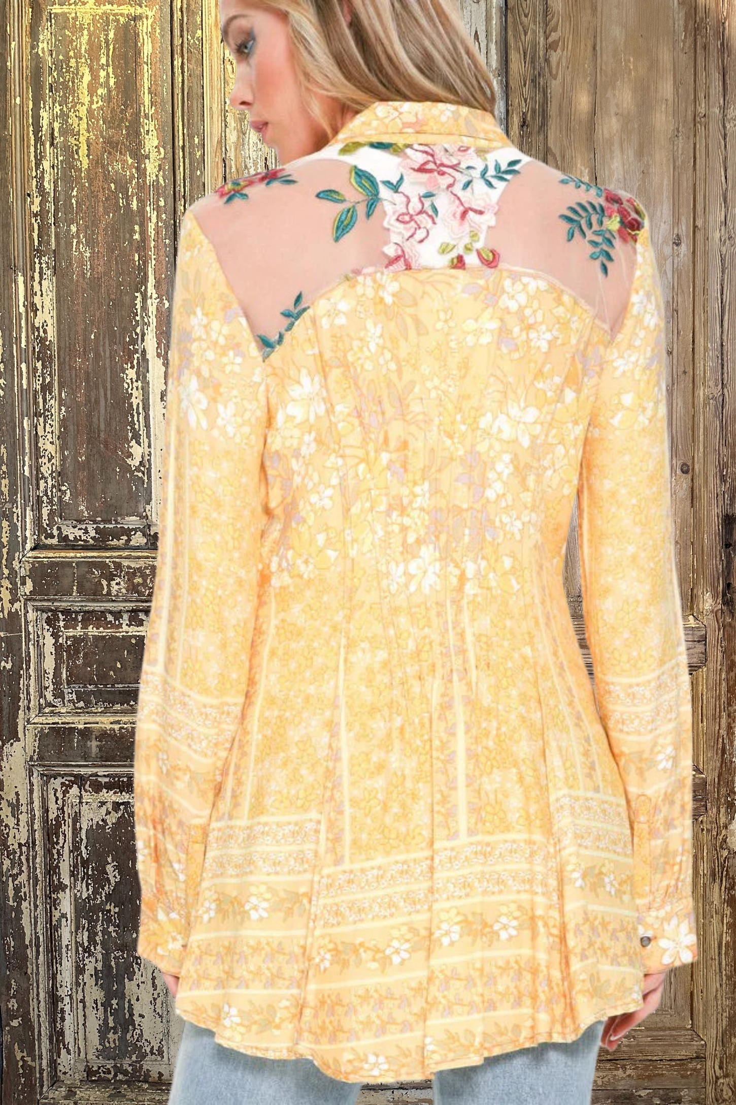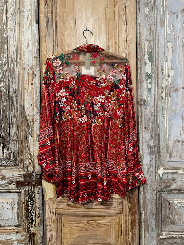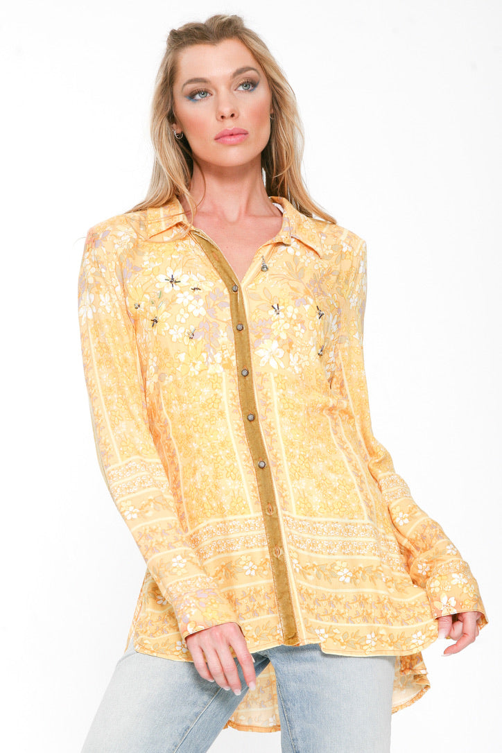 Introducing our playful Rise & Shine Shirt, designed for those who don't take themselves too seriously. Pintuck back pleats add a flattering fit, while the see-thru embroidered lace back detail adds a touch of quirky charm. With exquisite mini buttons and a contrast velvet front detail, this shirt is sure to make a statement. (Warning: may cause excessive compliments and attention.)
