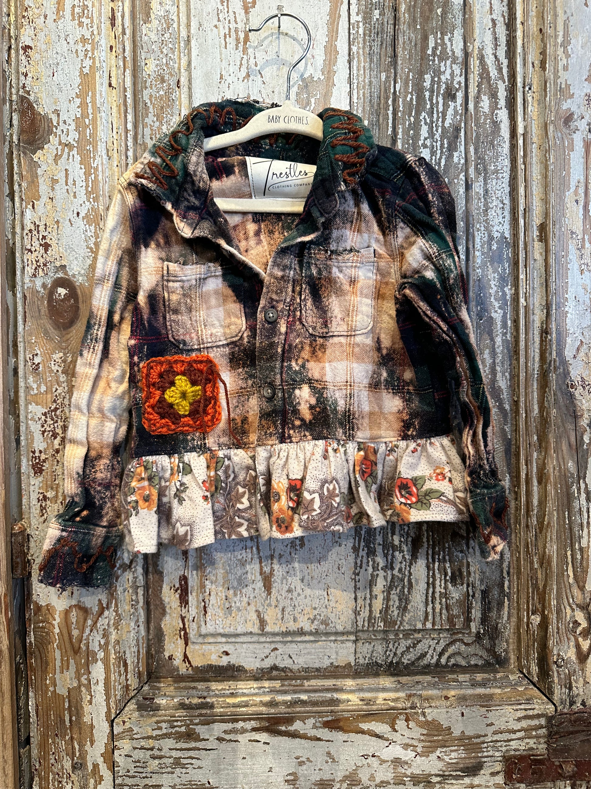 Introducing our Ruffled Crochet Plaid Shirt! This sweet plaid shirt is made from an up cycled kids plaid shirt and fabric scraps from old clothes for the ruffles. Aileen added her crochet magic to add a little handmade touch to this once upon cast off shirt she found at a thrift shop. This is a one of a kind item.