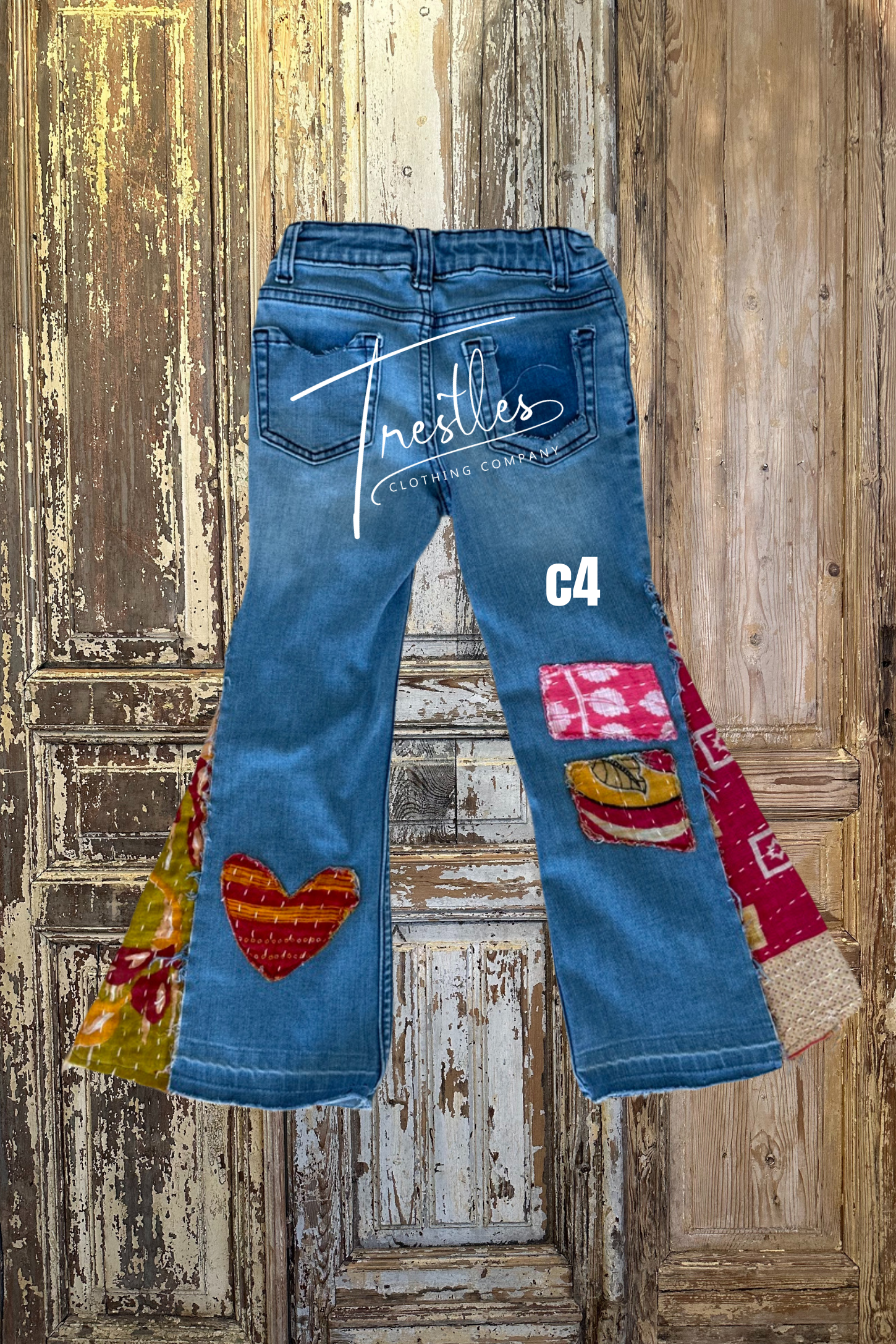 Our Kids Bell Bottoms are a fun and creative way to bring up-cycled style to your little one's wardrobe. These kids denim bell bottoms are patched with Indian Kantha fabric in front and back patches - perfect for making a fashion statement while showing your commitment to go green with baby!