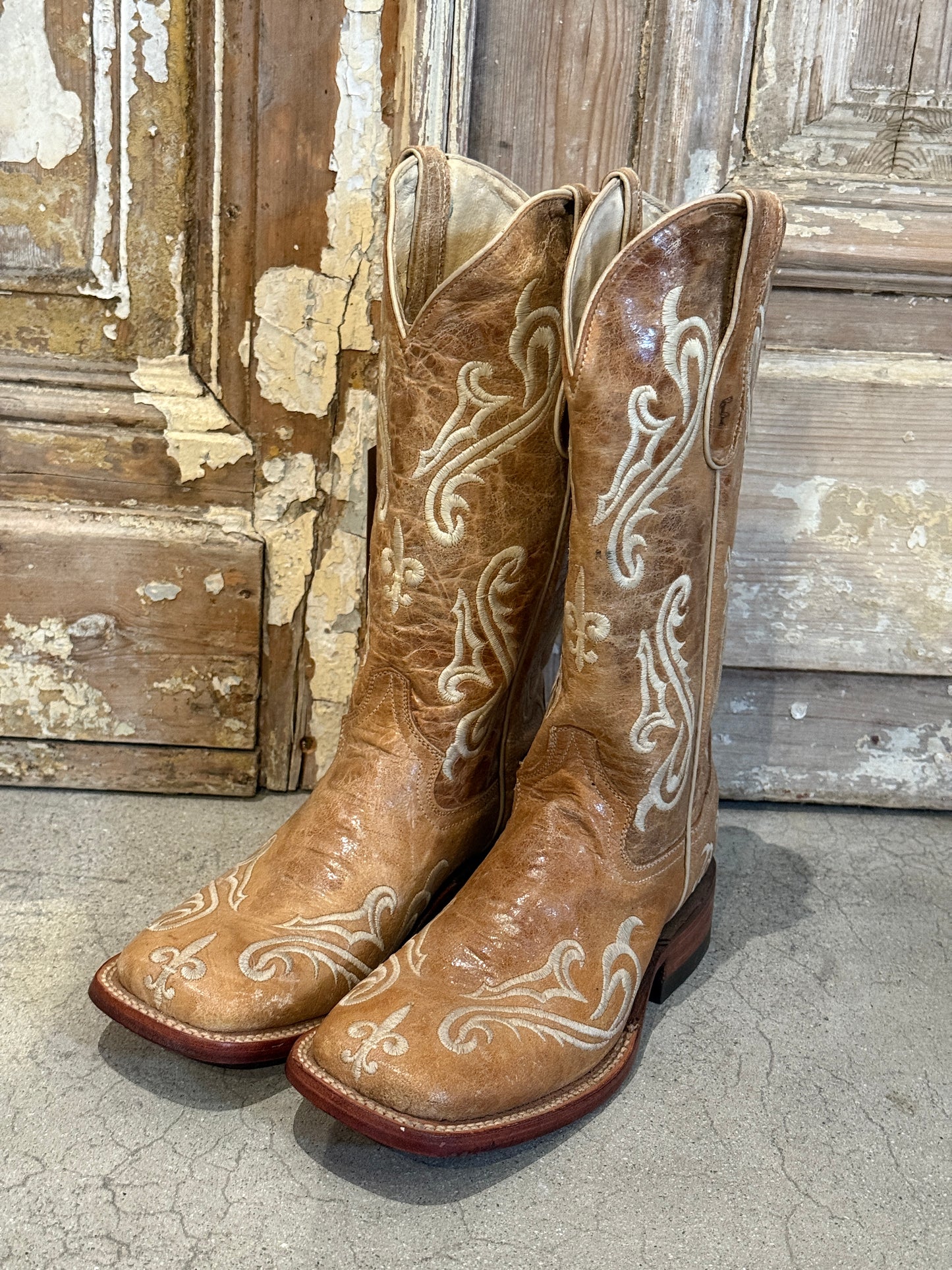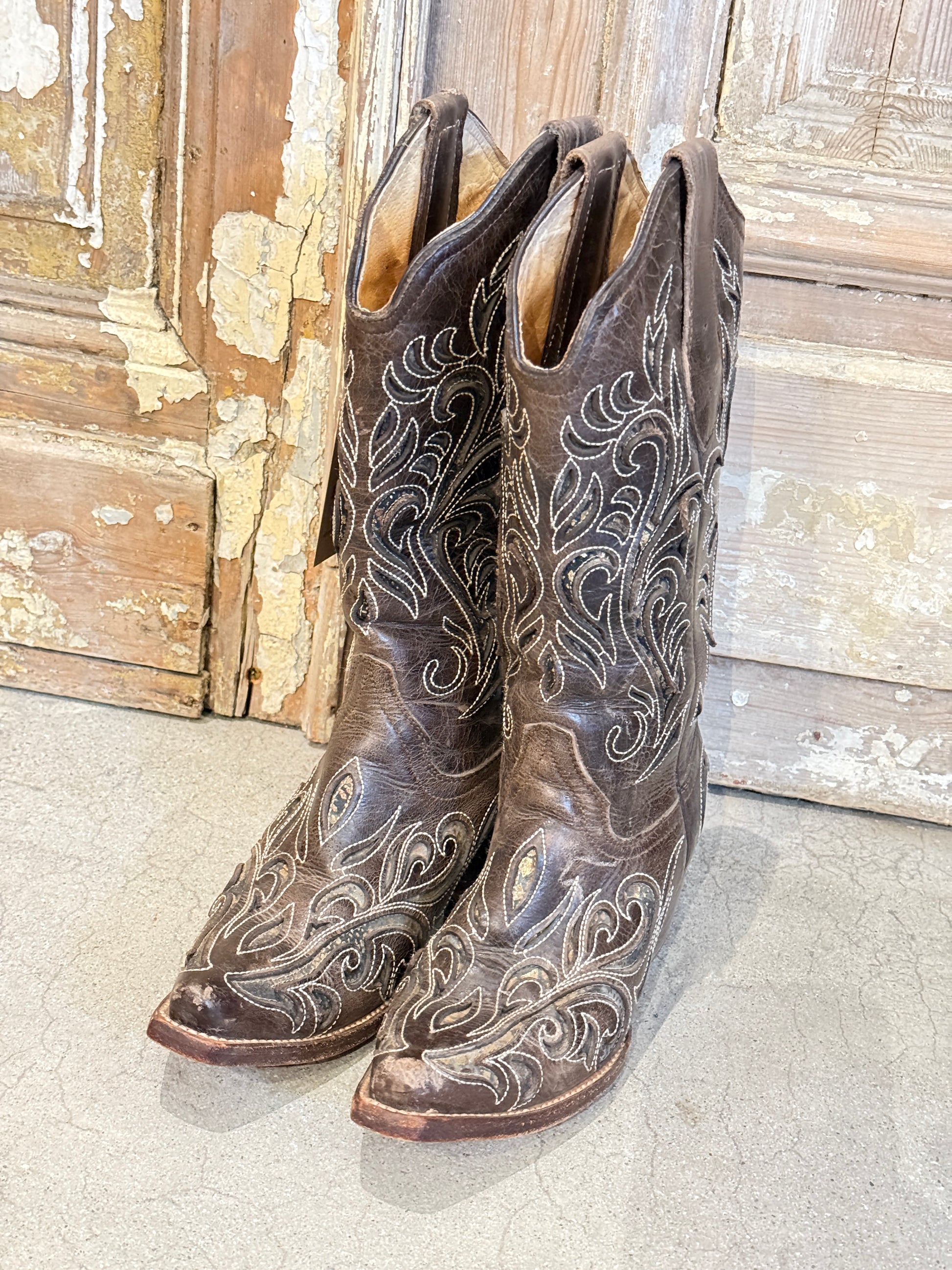 Gently used and loved Cowboy Boots from Texas.  All are one of a kind, no 2 are exactly alike.  Step up your denim and tee outfit with these cute Stagecoach inspired cowboy boots.  Worn in so you don't have to break them in. (Once in awhile we have our staff break them in even more!) We have one of each style only.