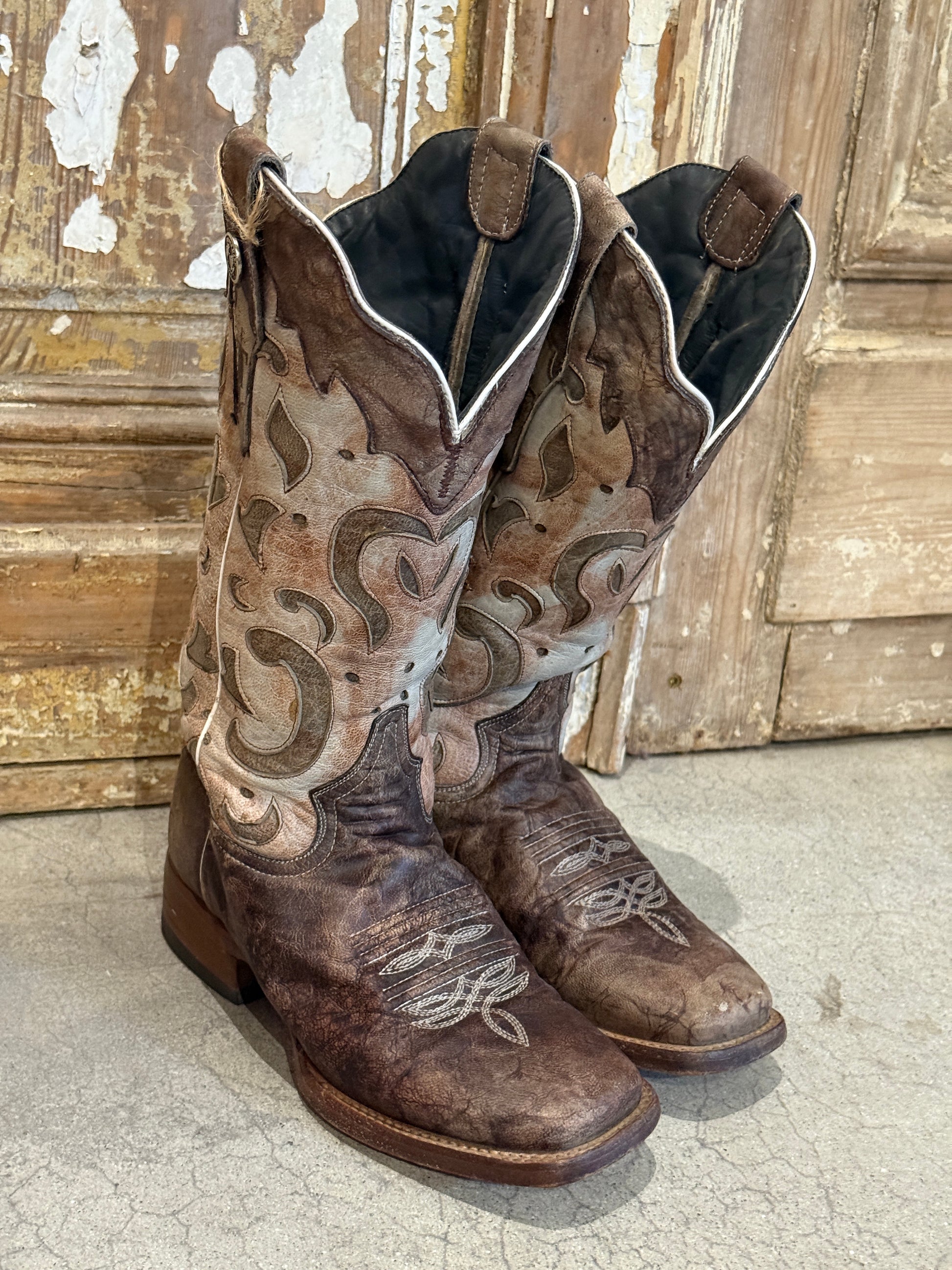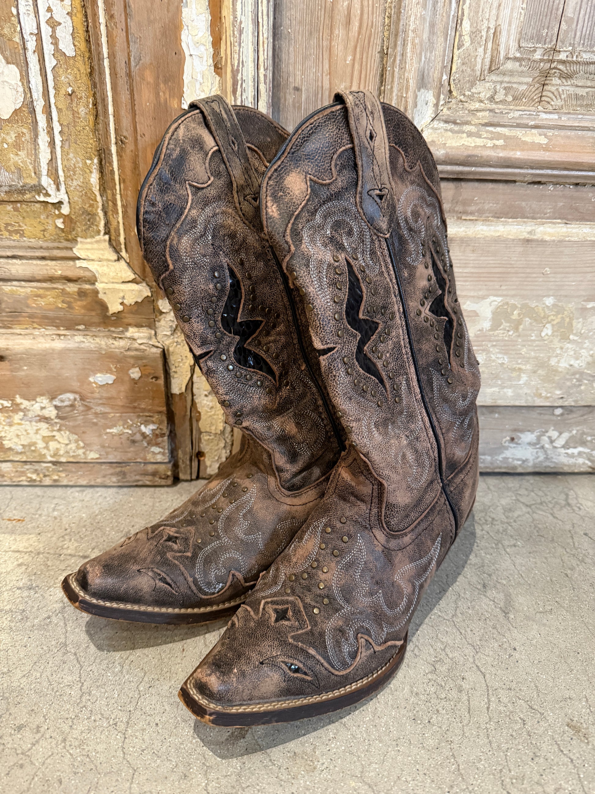 Gently used and loved Cowboy Boots from Texas.  All are one of a kind, no 2 are exactly alike.  Step up your denim and tee outfit with these cute Stagecoach inspired cowboy boots.  Worn in so you don't have to break them in. (Once in awhile we have our staff break them in even more!) We have one of each style only.