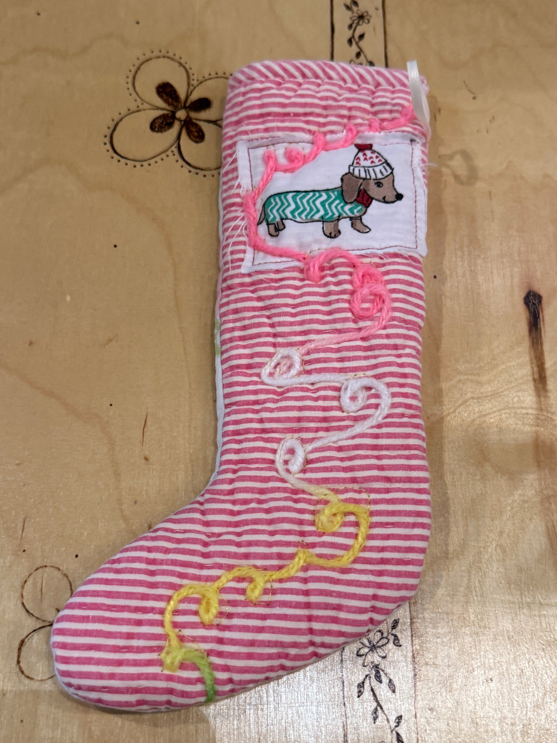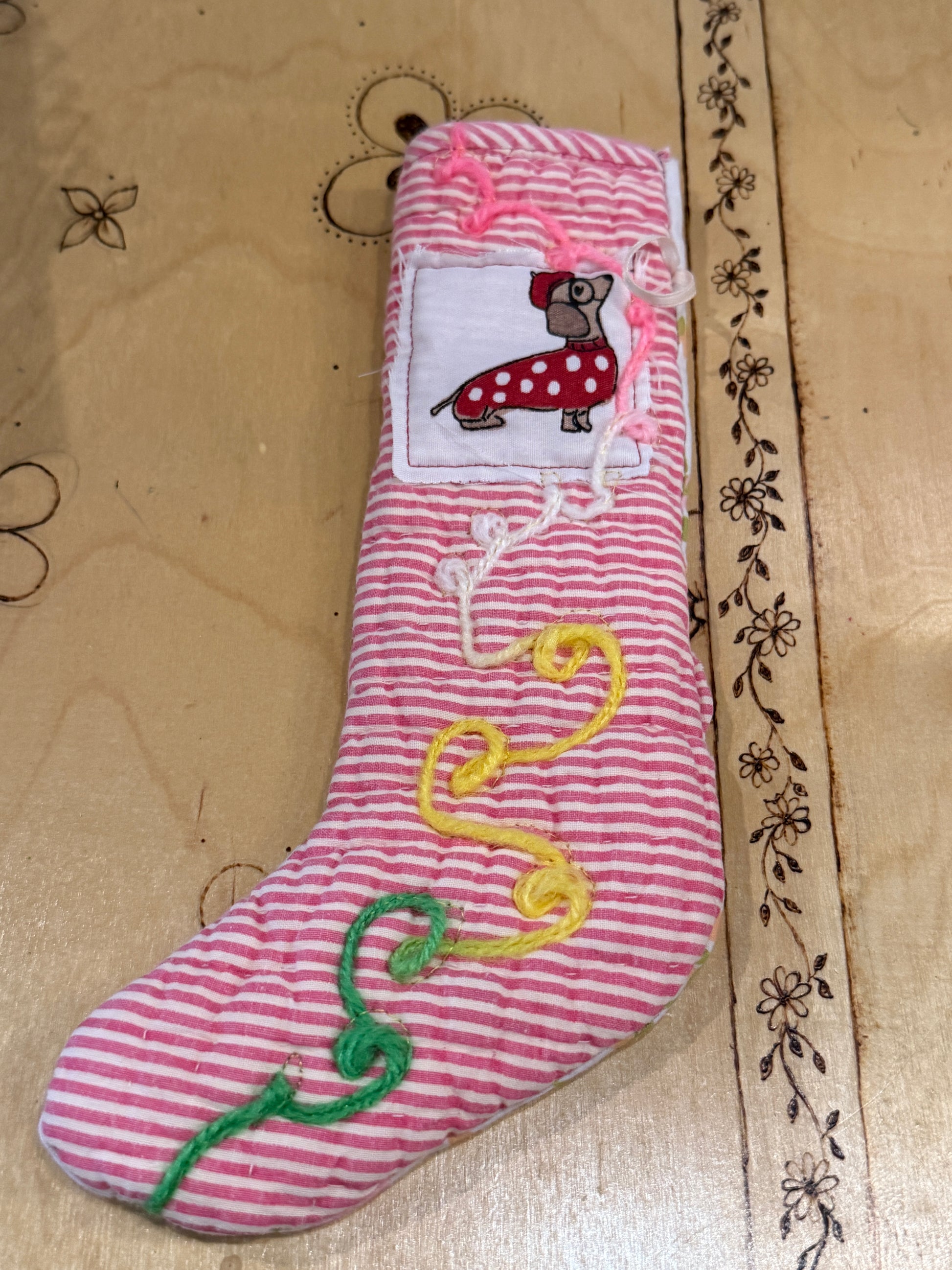 🎄✨ Each stocking stands about 8 inches tall, made with random fabric backing and finished with a loop created from the seams of old clothes or sheets (Aileen's scraps never go to waste!) — a sweet nod to sustainability and Aileen’s passion for giving cast-offs new life. Some are perfectly worn, others more tattered, but every single one tells a story.