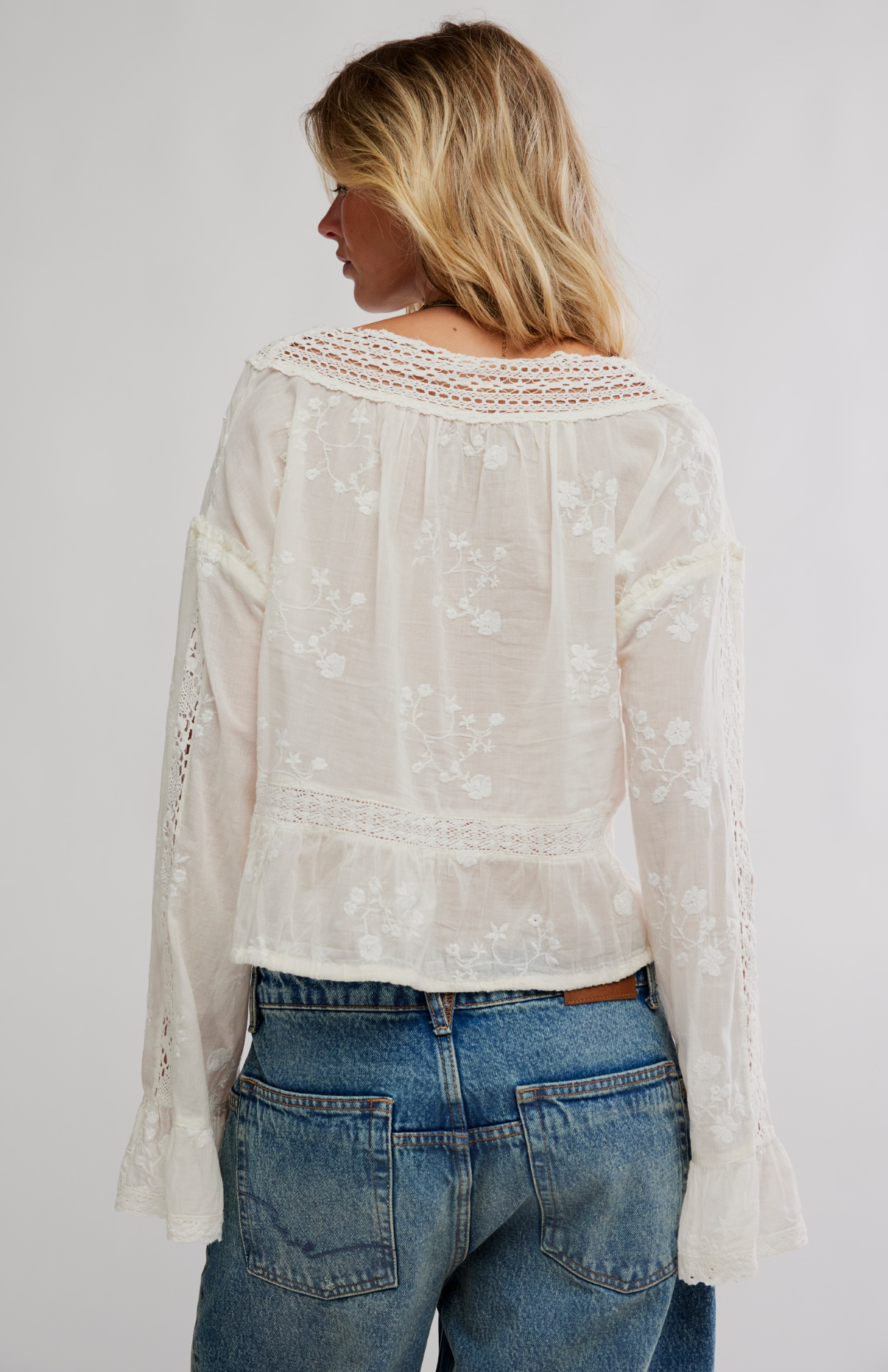 Romance meets free spirit with this vintage-inspired beauty. The Sweet Love Blouse brings all the dreamy details—delicate lace in the front and back, flowy long sleeves with a subtle flare, and a waist tie that gives it that just-right shape. Cropped to perfection, this blouse buttons in front for a timeless, feminine finish.