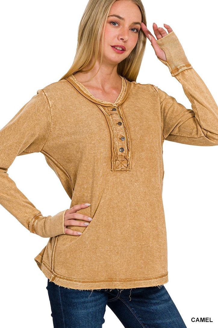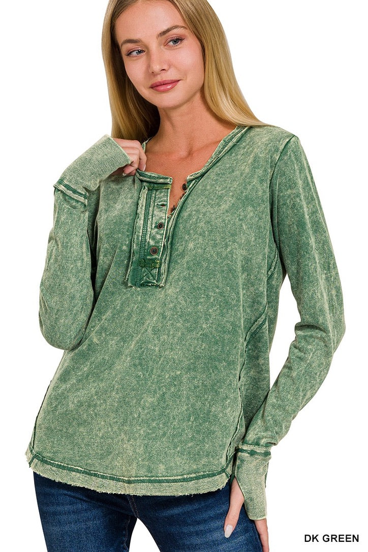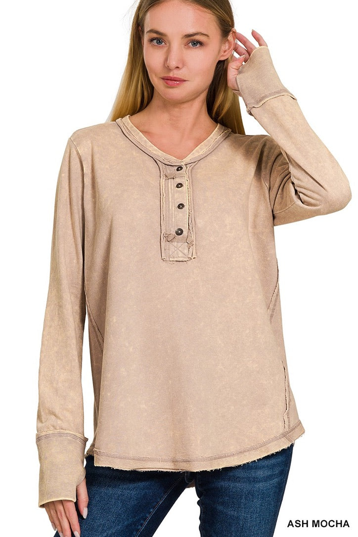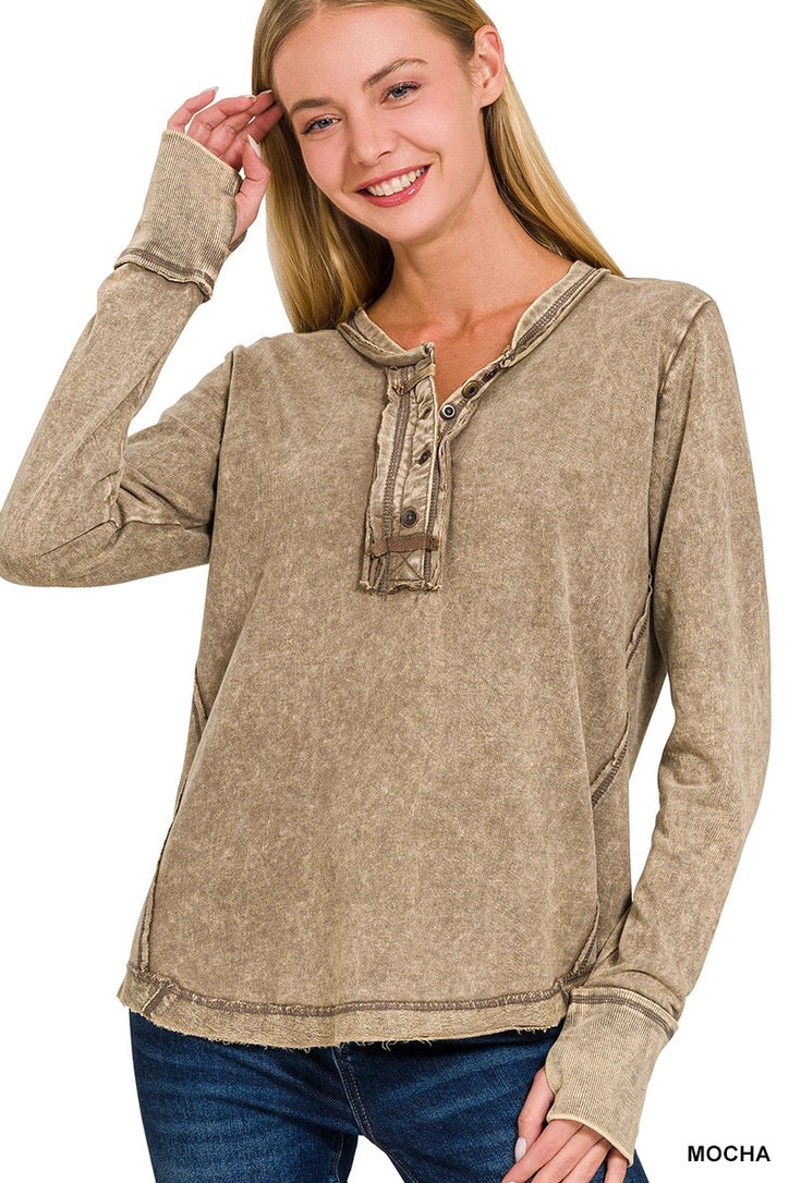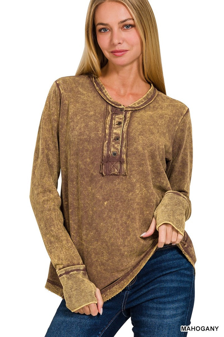 Be casual and stylish with our Thumbhole Cuff Mineral Washed Henley! Its vintage look will make you stand out in a crowd. The thumbhole adds a cool look! Oversized for a modern, fashionable fit. Get ready to rock with our stylish henley!